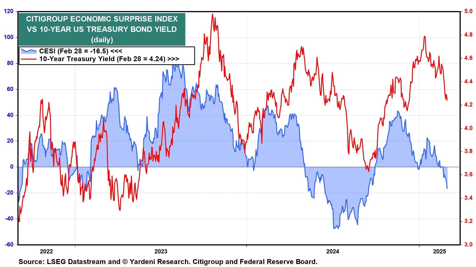 February's batch of economic indicators for January was mostly downbeat, the sort of numbers suggestive of a severe economic slowdown. They caused a few economists to raise their odds of a recession but not us. Indeed, the Citigroup Economic Surprise Index fell to -16.5, the weakest since the summer of 2024 (chart). The 10-year Treasury bond yield fell to 4.24% on Friday from a peak of 4.81% in January.