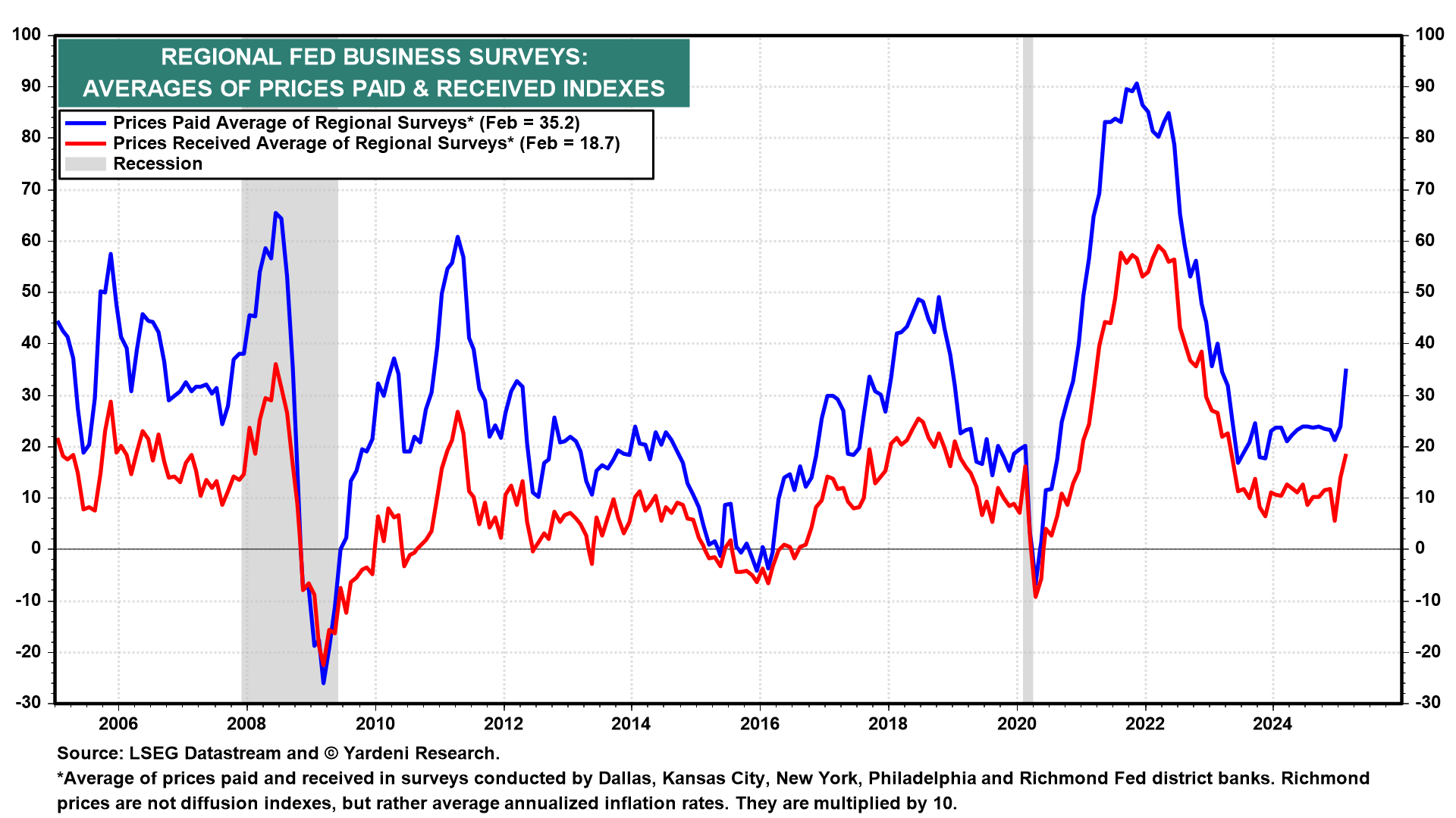 The bad news is that February's prices-paid indexes in both the M-PMI and NM-PMI reports are likely to show that Trump 2.0's tariffs are already heating up inflation, at least on a temporary basis. That's the message from the regional business surveys (chart).
