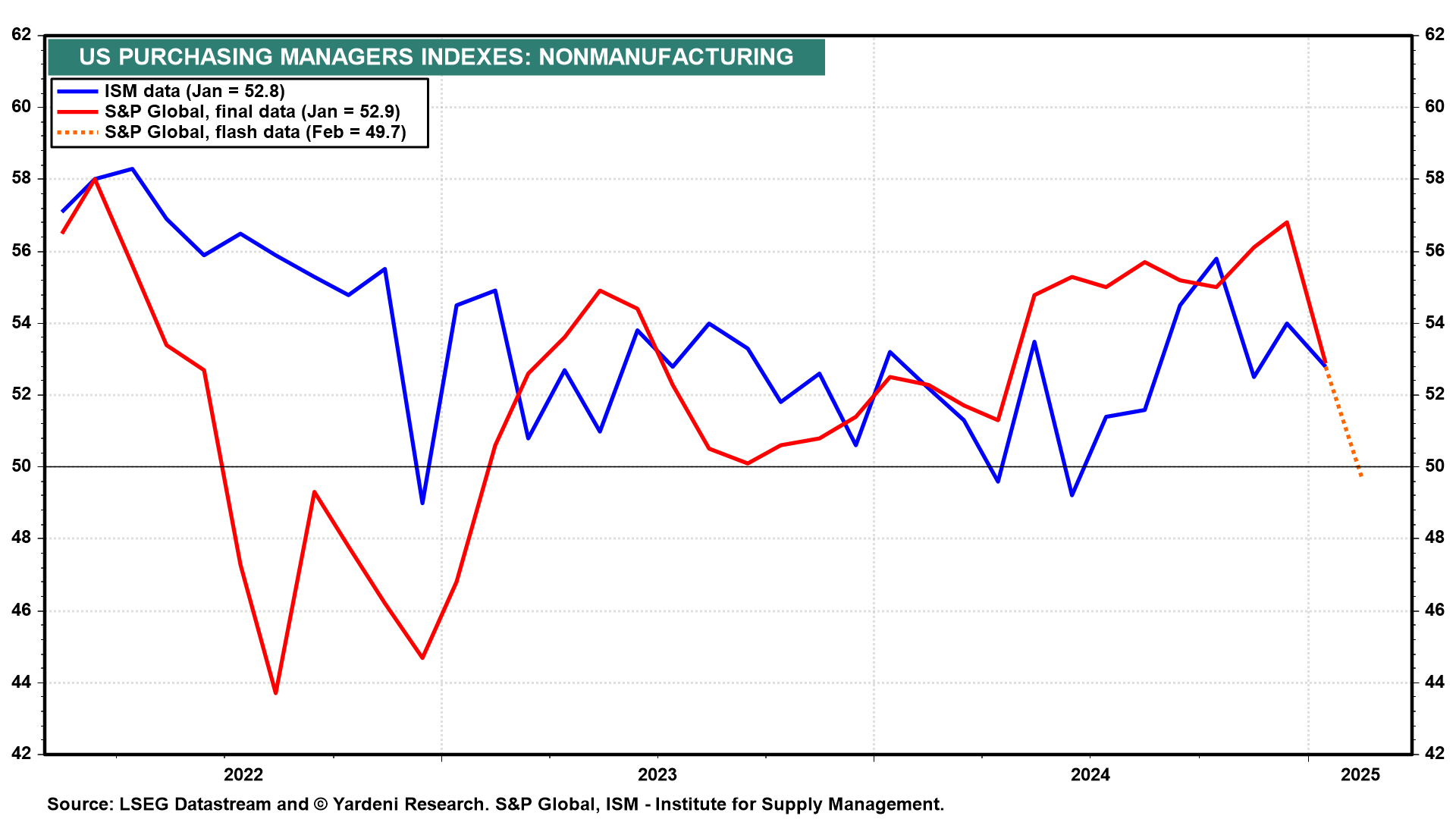 Contributing to the recent selloff in the S&P 500 from its record high on February 19 was S&P Global's January Non-Manufacturing PMI, which was released on February 21. It dropped slightly below 50.0 for the first time since the pandemic (chart). We aren't convinced that the services economy was that weak in February. We expect that the ISM NM-PMI (Wed) will show more strength.