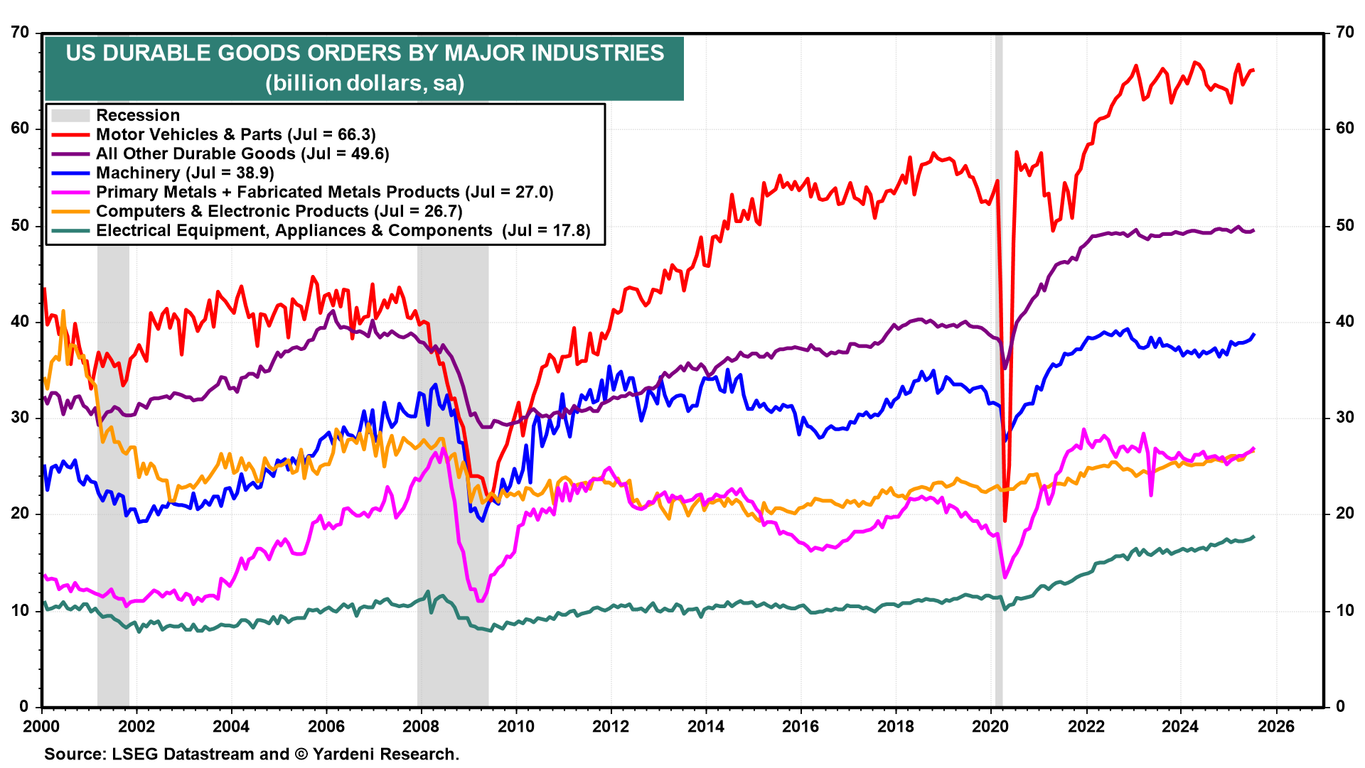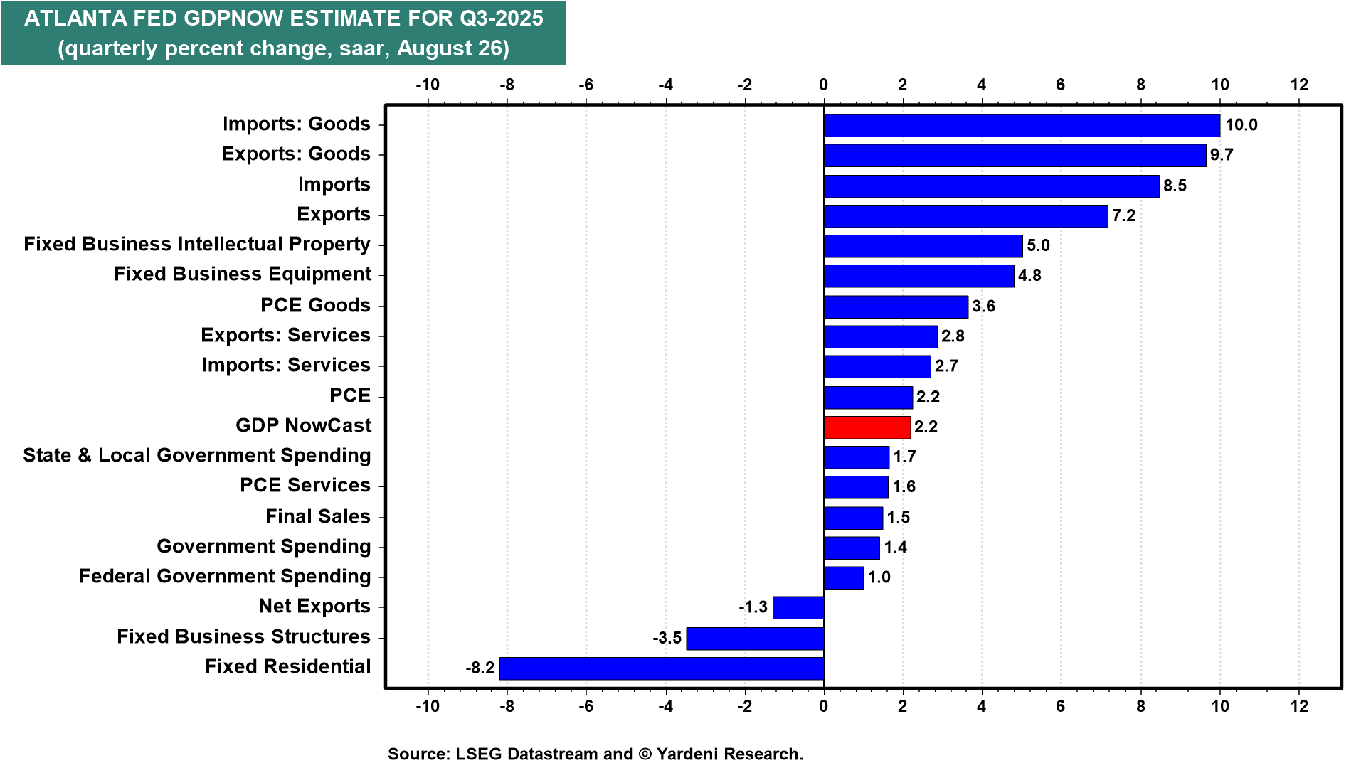 The Atlanta Fed's GDPNow model is tracking Q3's real GDP growth rate at 2.2% (saar). Several important components of GDP are growing at faster rates, including fixed business equipment and consumer spending on goods (chart).