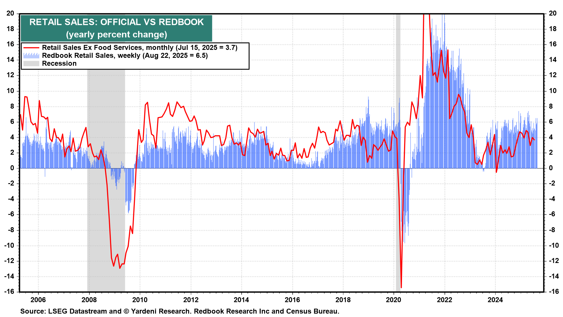 Meanwhile, retail sales growth remains strong, according to the weekly Redbook retail sales index through the week of August 22 (chart).