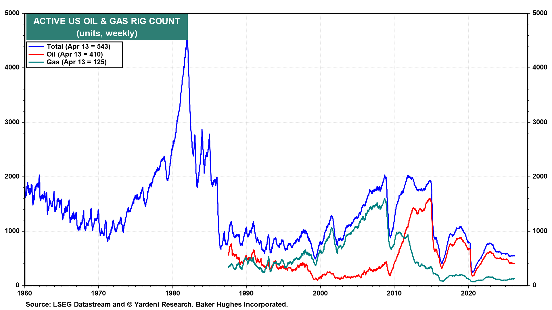 (2) US oil industry. The US energy sector has undergone a quiet structural revolution over the past four decades. The active rig count peaked in the early 1980s and has never come close to those levels since, reflecting a fundamentally leaner and more technologically advanced industry that today wrings far more production from each well than at any prior point in history.