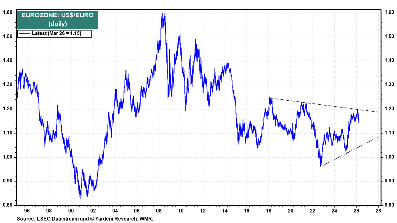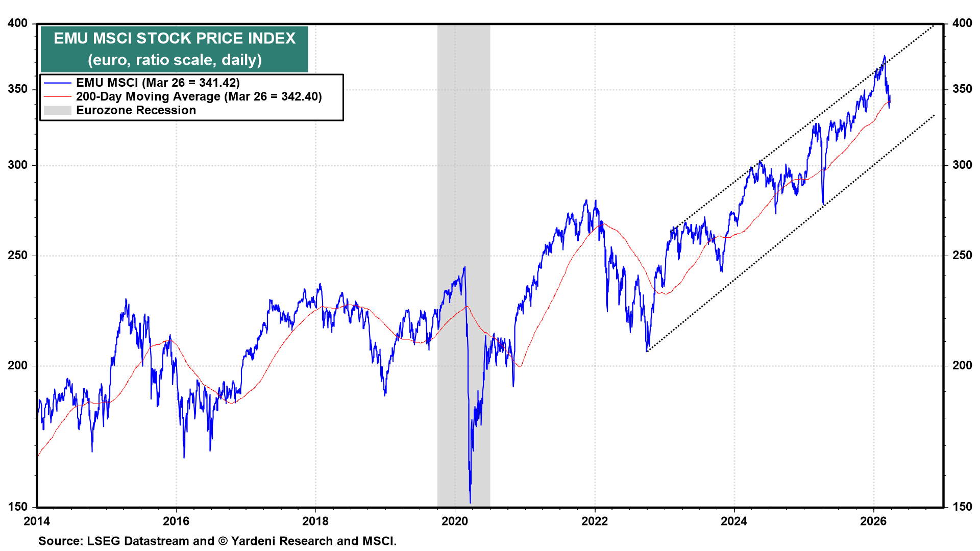 Financial markets now are pricing in one to two 25bps ECB rate hikes through the remainder of 2026, a significant reversal from expectations of further easing just a few weeks ago. As a result, the EMU MSCI stock price index in euros is down 8.7% from its record high on February 25, but may find support at its 200-day moving average (chart).