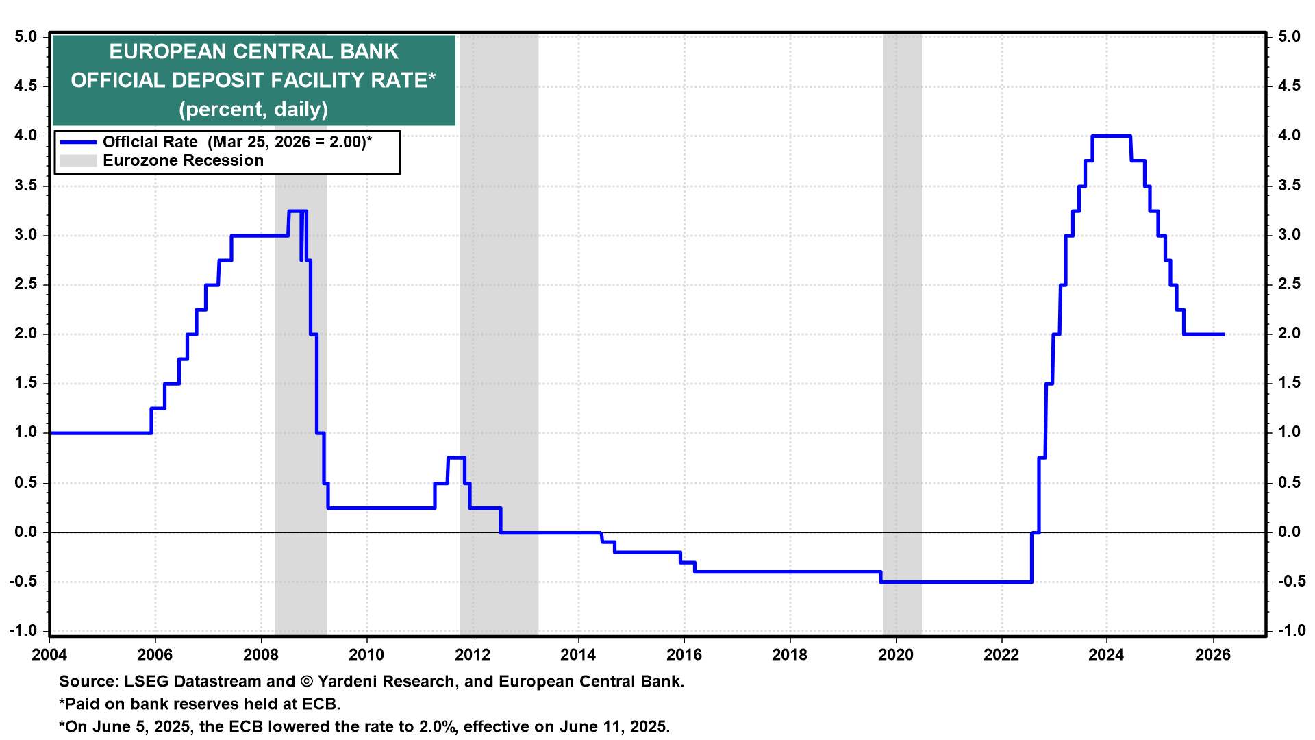 The European Central Bank (ECB) had cut its official deposit rate eight times since June 2024, bringing it to 2.00%, and further easing was likely this year (chart). The ECB has made clear that it won't let a new energy-led spike in inflation take root in the Eurozone, strongly hinting at interest-rate hikes in the coming months.