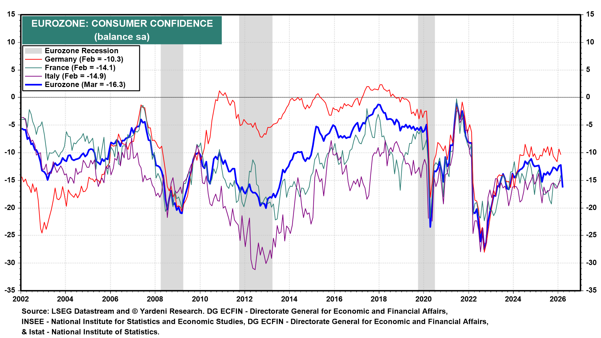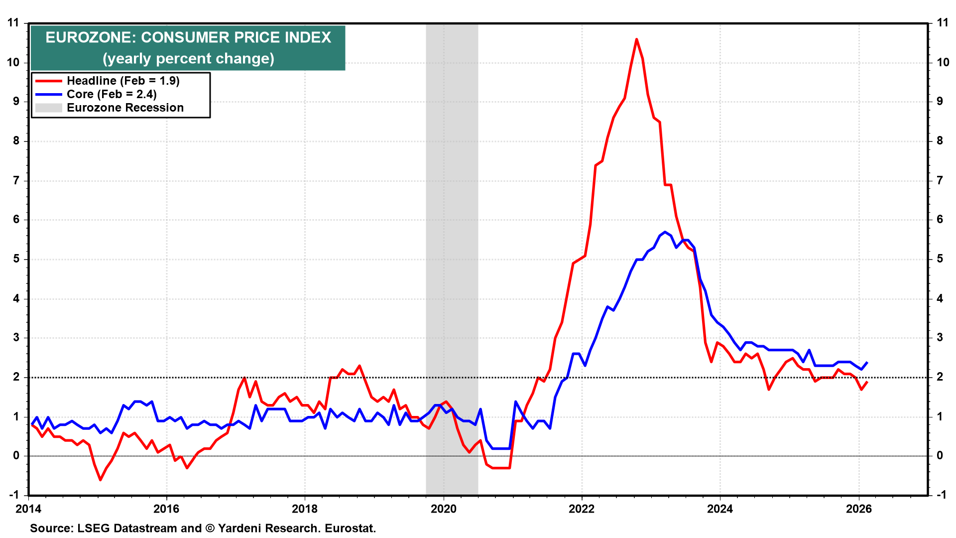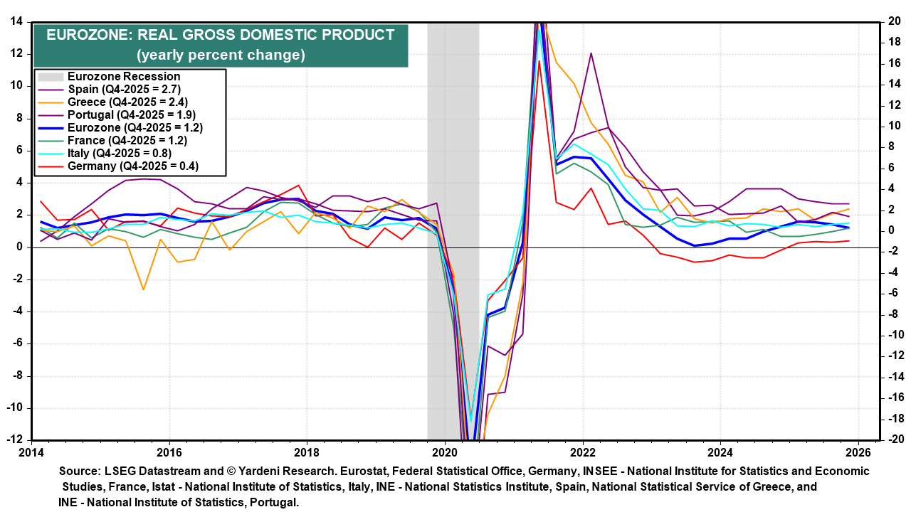 Other available economic indicators are pre-war. The Eurozone's real GDP rose 1.3% y/y through Q4-2025 (chart).