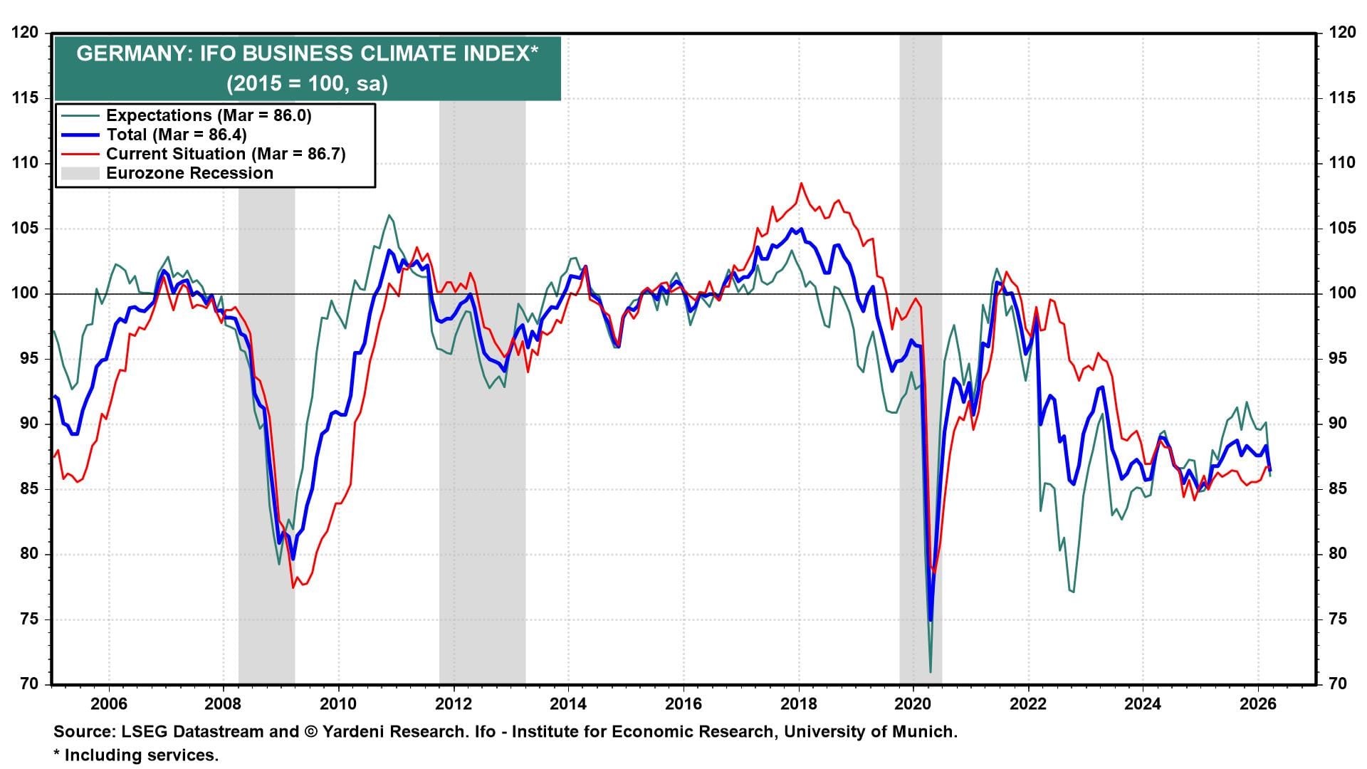 The March reading of Germany's Ifo Business Climate Index fell, led by a sharp drop in expectations (chart). Deutsche Bank has cut its German growth forecast for 2026 from 1.5% to 1.0%, warning that surging energy prices will weigh on the trade balance, dampen consumer spending, and exacerbate existing competitiveness challenges for the German industry, which already faced structurally uncompetitive energy costs before the oil-price shock.
