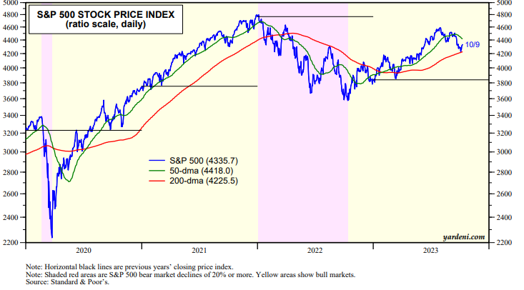 The bond market was closed today for Columbus Day. However, the iShares 20+ Year Treasury Bond ETF (TLT) surged 2.34%. This evening, the 10-year US Treasury bond yield dropped from 4.80% on Friday to 4.65%. The S&P 500 was weak in the morning, but rose 0.63% today (chart). It held its 200-day moving average last week (chart). That's impressive given that oil prices surged today after Hamas attacked Israel over the weekend.