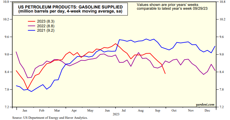 Any further increase in oil prices is likely to cause Saudi Arabia to increase its production and exports to keep the price of oil below $100 a barrel. Oil producers just recently learned that the sharp increase in the price of a barrel of crude oil during Q3-2023 immediately depressed oil demand, especially gasoline usage in the US (chart).