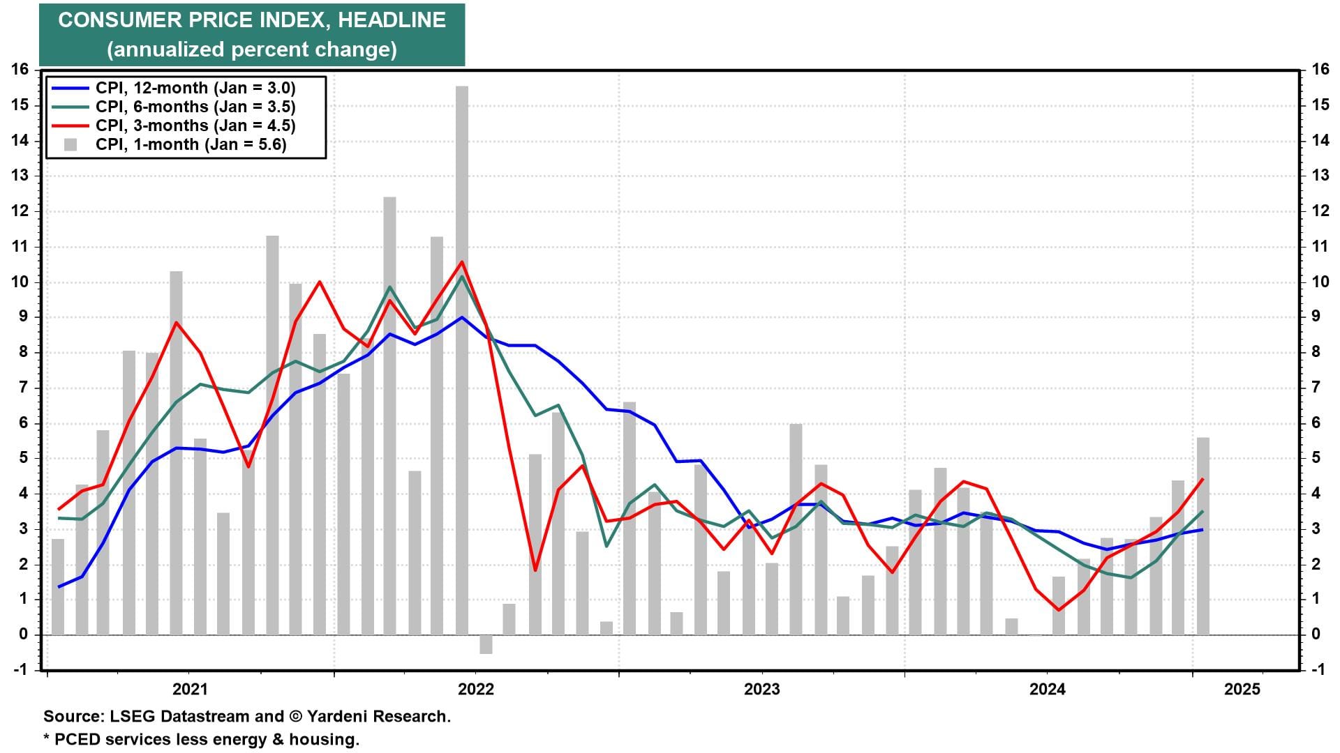 Today's hotter-than-expected January CPI inflation did some damage to bonds, raising long-term Treasury yields roughly 10bps. Headline and core CPI rose 0.5% and 0.4% m/m, respectively, as many companies set their annual price increases. But this wasn't a start-of-the-year blip; inflation has been rising since last summer (chart). So after 100bps of federal funds rate (FFR) cuts from September 18 through December 18 last year, the Fed's easing cycle is on pause for the remainder of the year, as we've been predicting.
