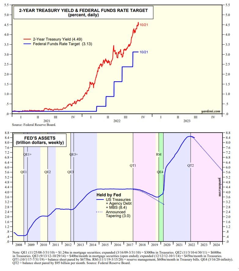 The S&P 500 rallied 2.37% to 3,752.75 on Friday as the 2-year US Treasury note yield fell to 4.50% from 4.61% on Thursday (chart). The happy day's performance was sparked by Friday's WSJ article titled "Fed Set to Raise Rates by 0.75 Point and Debate Size of Future Hikes." It was written by the Journal's ace Fed watcher, Nick Timiraos.