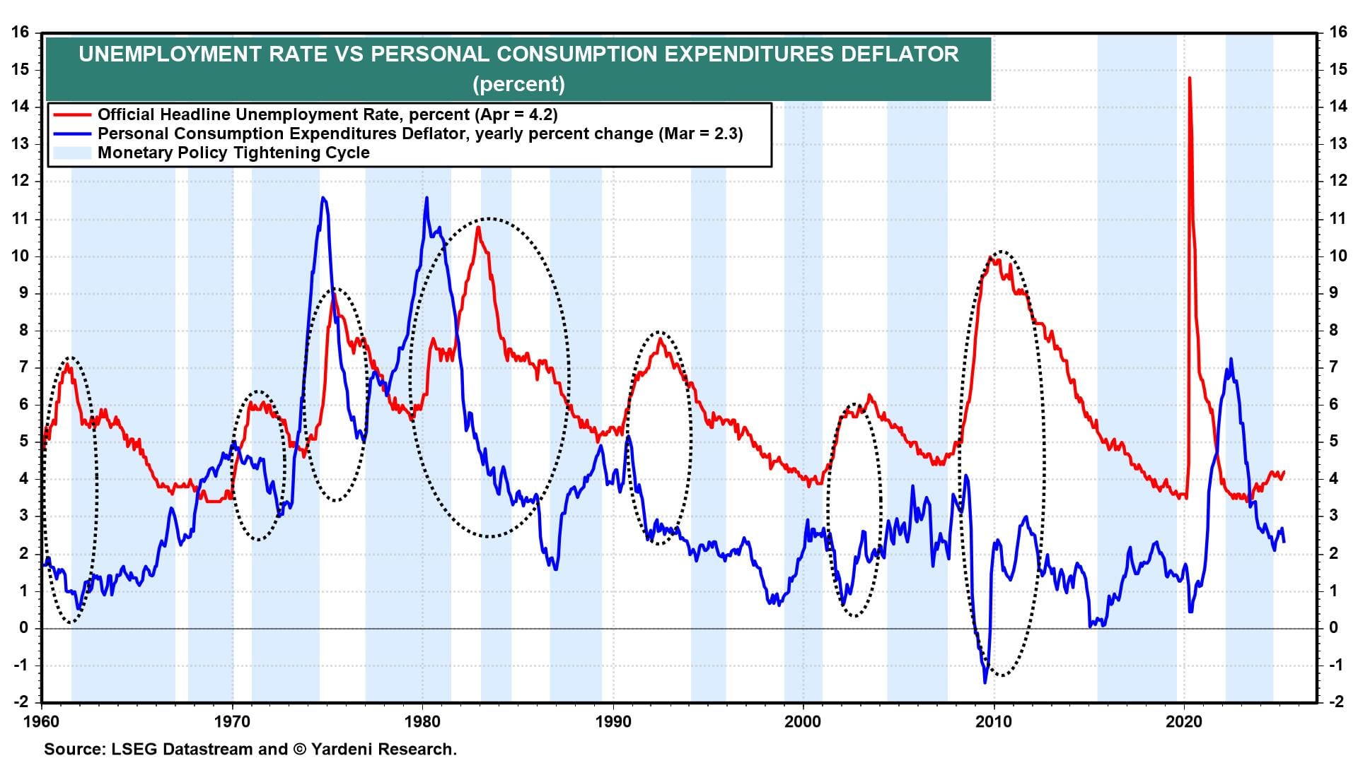 In the past, rising unemployment and falling inflation caused the Fed to lower the FFR (chart). This time, the unemployment rate remains low, and so does inflation. The former is likely to rise less rapidly than the latter in coming months. Given that likelihood, the Fed should remain on hold.
