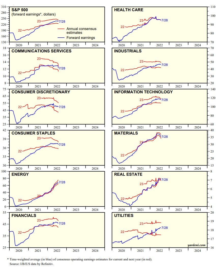 The S&P 500 is up 13.3% since it bottomed at 3666 on June 16. One week after it bottomed, S&P 500 forward earnings peaked at a record high. It's been edging down since then as industry analysts have turned more cautious on the earnings outlook for 2022 and 2023.