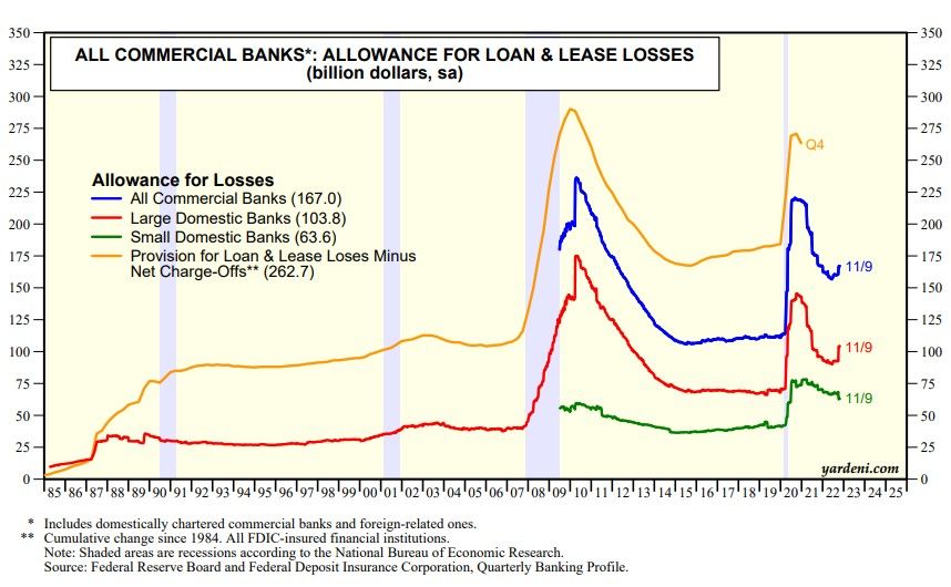 (3) Loan loss provisions. We track the Fed’s weekly data on provisions for loan losses at all commercial banks in the US. This year, they bottomed during the June 8 week and are up just $10.5 billion to $167.0 billion through the week of November 9.