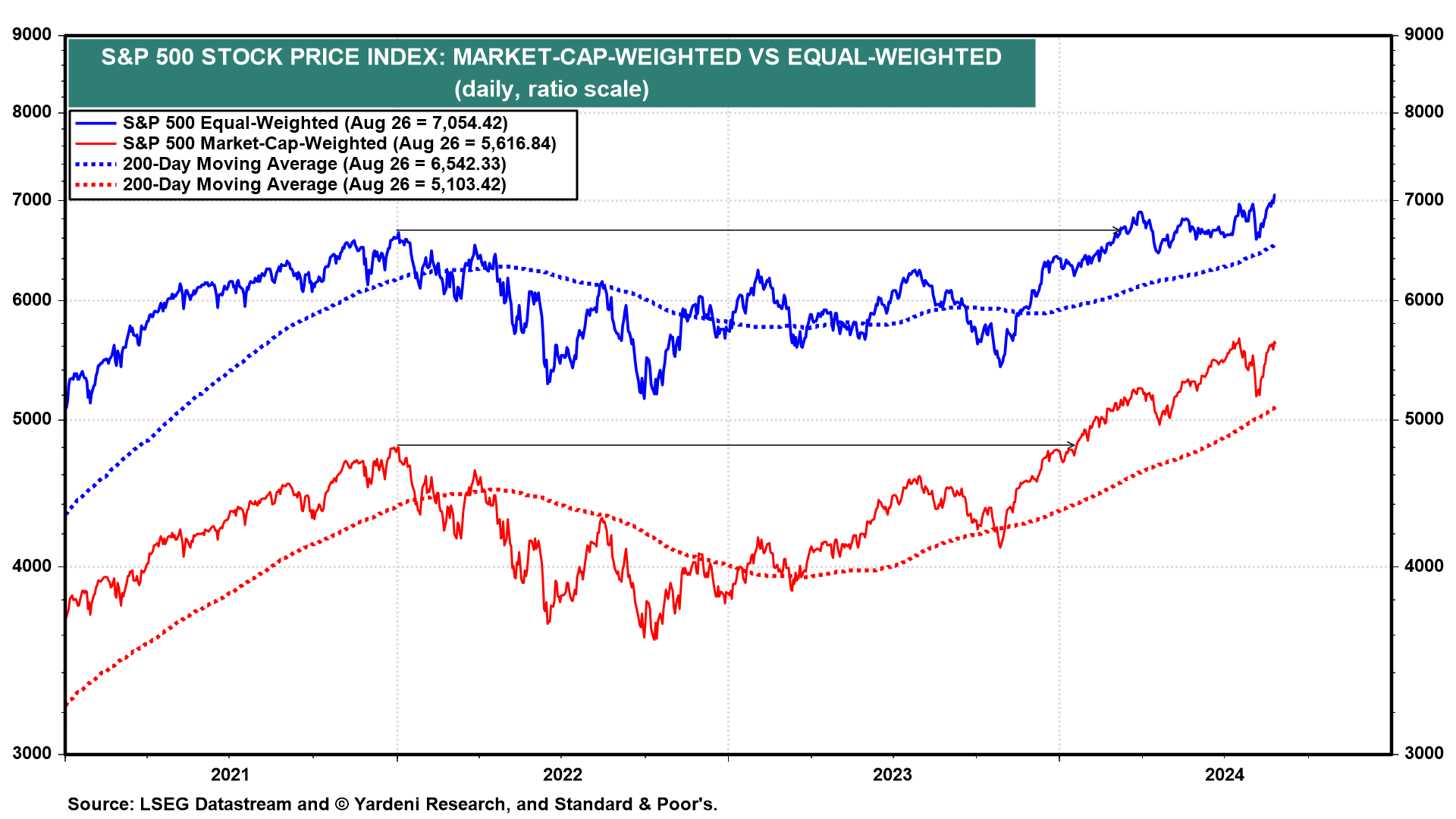 The world is getting more dangerous. That doesn't seem to be having any impact on the US stock market. The S&P 500 is less than 1% below its July 16 record high, while the equal-weighted version of the index is at a record high (chart).