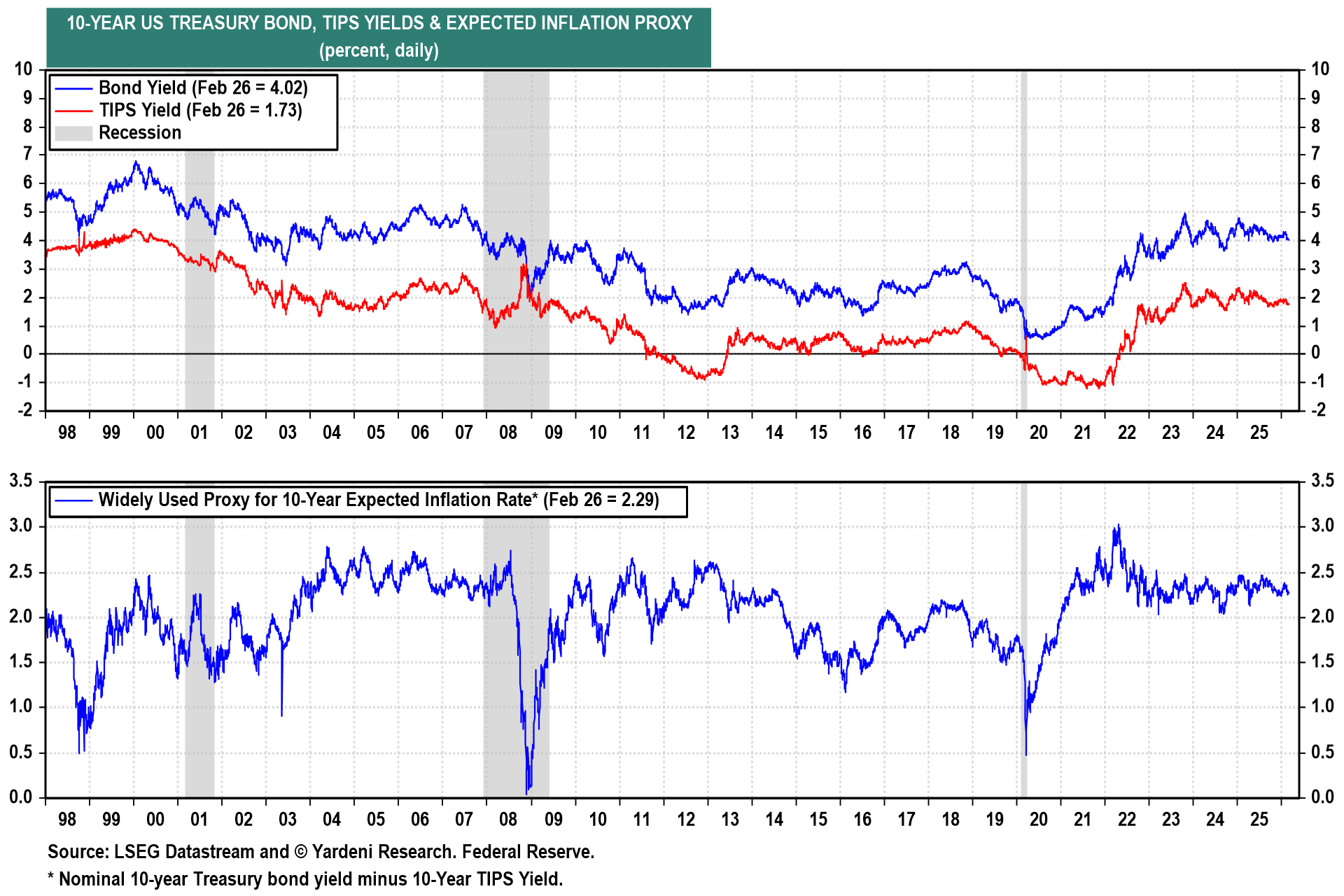 It was surprising to see the bond yield fall below 4.00% today despite a hotter-than-expected PPI inflation reading. In any event, both the nominal and real 10-year bond yields have been relatively flat since 2023 (chart). We think the trend will remain flat through the end of this year.