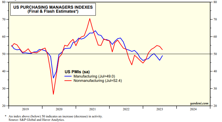 (1) US PMIs. The S&P Global M-PMI for the US edged up in July to 49.0 (chart). It has been mostly below 50.0 since November 2022, as consumers have pivoted from buying goods to buying services. The NM-PMI edged down to 52.4 in July, remaining above 50.0 since February.