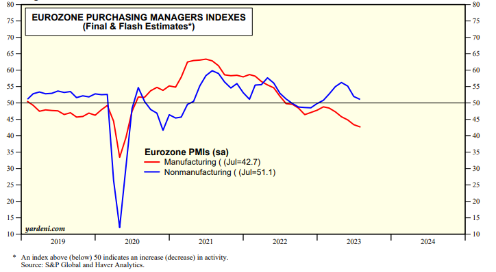 (2) Eurozone PMIs. The Eurozone M-PMI has been below 50.0 since July 2022 (chart). It was 42.7 in July, the lowest since May 2020. The region’s NM-PMI was 51.1 during July, the weakest since January.