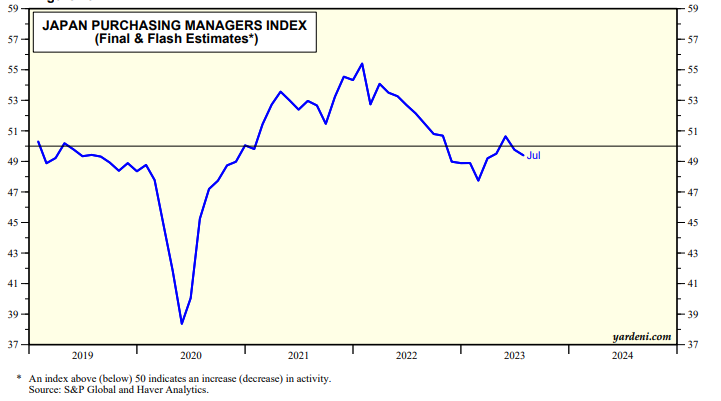 (3) Japan PMI. During July, Japan’s M-PMI edged down to 49.4 from 49.8 in June (chart). It has been mostly below 50.0 since November 2022.