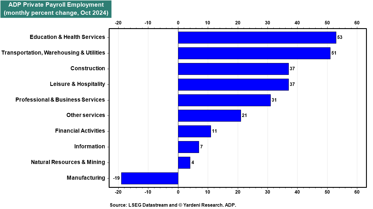 A few economists predict that layoffs by Boeing and Stellantis, along with Hurricanes Helene and Milton, will combine with a cyclical slowdown to lead to the first negative payrolls print since the pandemic on Friday. ADP's data did show that private manufacturers reported 19,000 in job losses this month. However, all other sectors reported gains (chart). Private wages also increased 4.6% y/y.