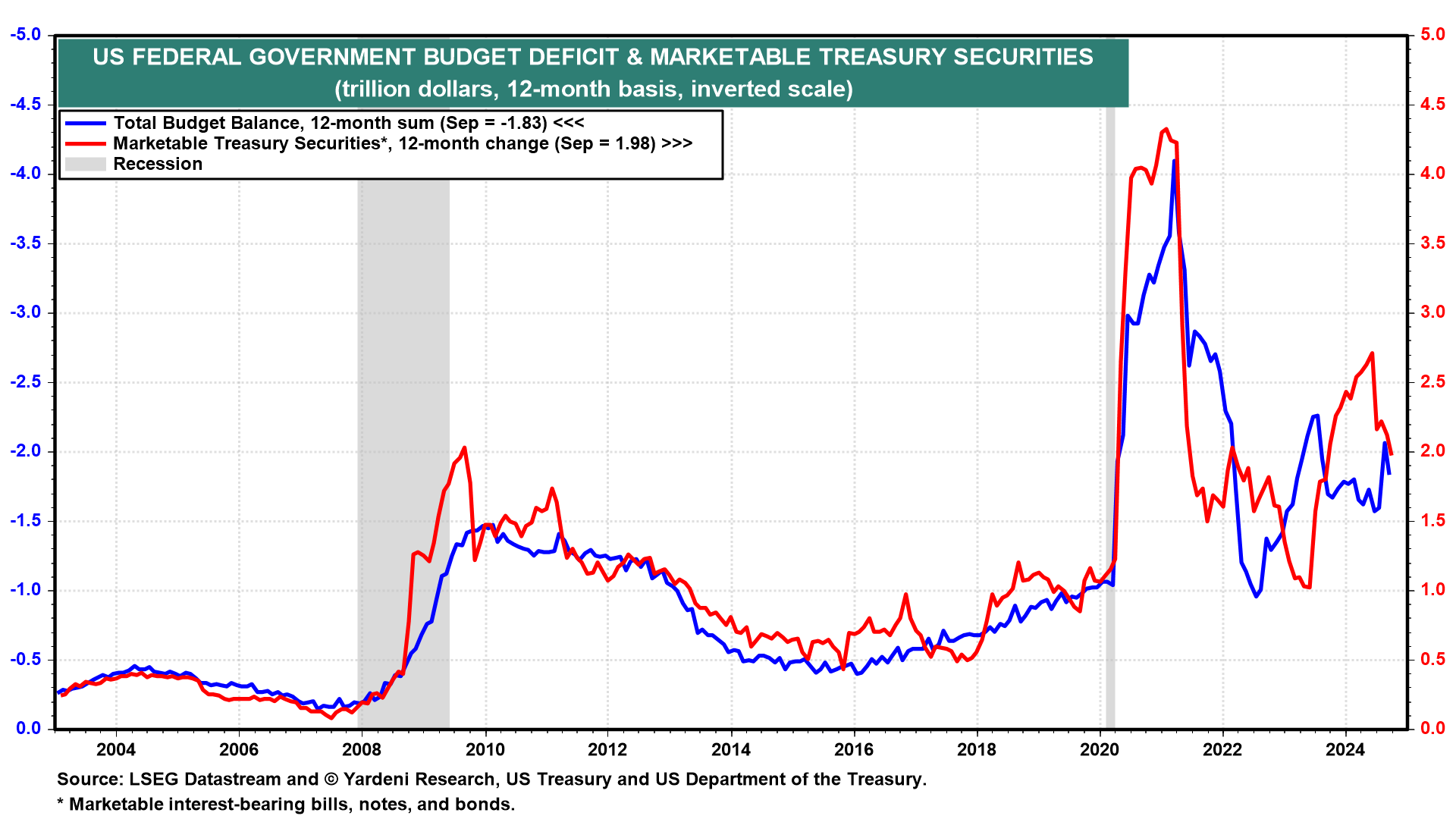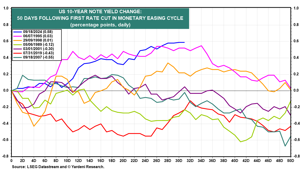 The problem is that the bond yield has been rising and tightening credit conditions ever since the Fed eased credit conditions! That's a rather unusual response to the first rate cut in a monetary easing cycle (chart). The bond market agrees with our opinion that the Fed cut the FFR too much, too soon. Indeed, the latest economic indicators have been strong, as we expected. In addition, the US Treasury Department plans to raise a whopping $1.3 trillion over the next six months.