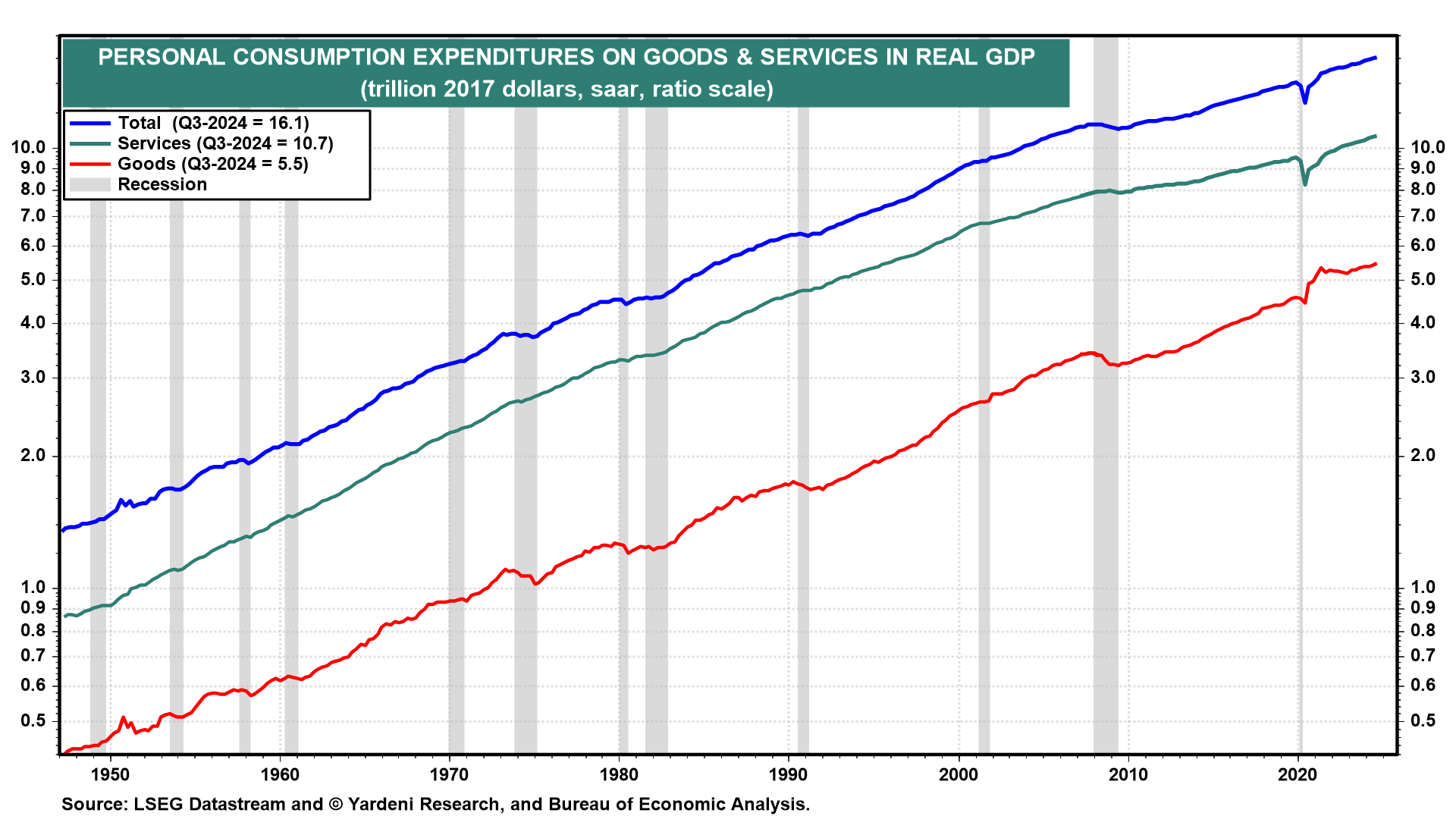 (1) GDP. Q3 real GDP grew 2.8% (saar) to a new record high (chart). Though the first estimate of Q3 growth was a tad softer than the 3.0%+ we were expecting, the 3.2% increase in real final sales to private domestic purchasers suggests the two-year streak of strong quarterly growth is on solid footing. Consumer spending rose 3.7%, the strongest quarterly increase since Q1-2023, led by a 6.0% rise in goods spending.