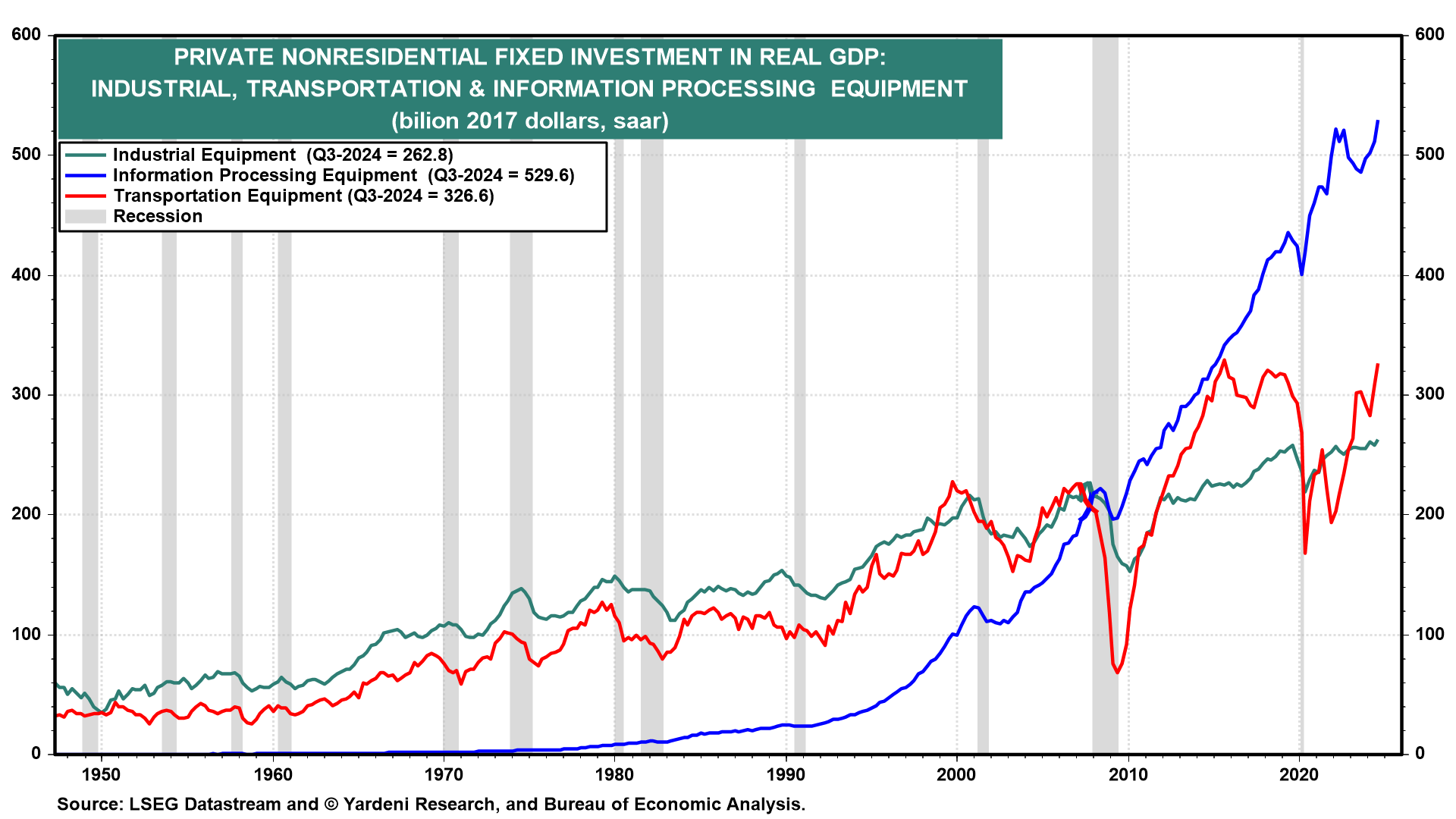 Investment in business equipment jumped 11.1%, following a strong 9.8% increase in Q2. That was led by a new record high in information processing equipment investment and rising transportation equipment investment (chart).