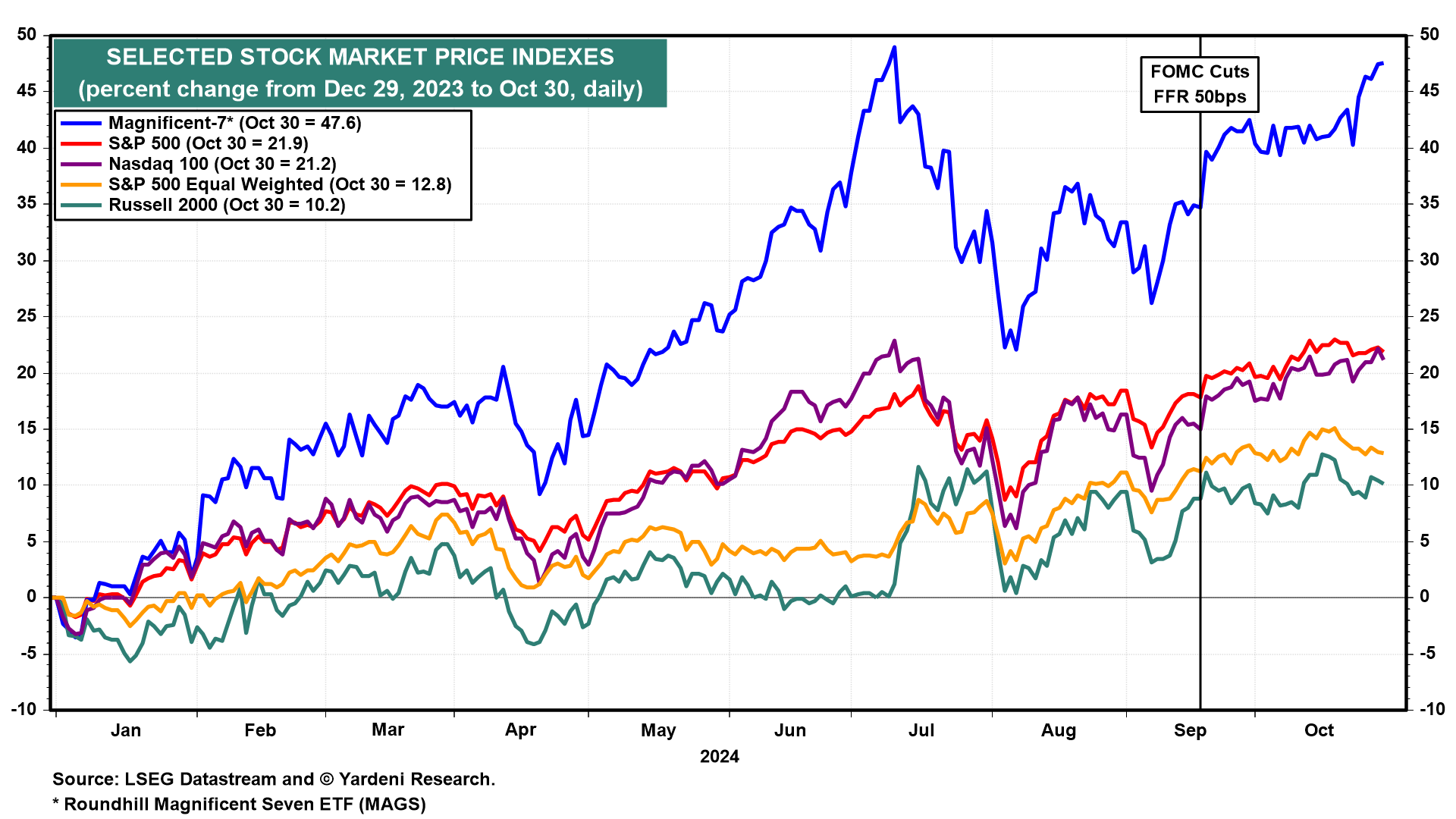 The S&P 500 equal-weighted index has been going nowhere fast since the Fed cut the federal funds rate (FFR) by 50bps on September 18 (chart). The same can be said for the Russell 2000. The stock market rally has stopped broadening since the Fed's rate cut! Why is that given that the current earnings season has been mostly upbeat?