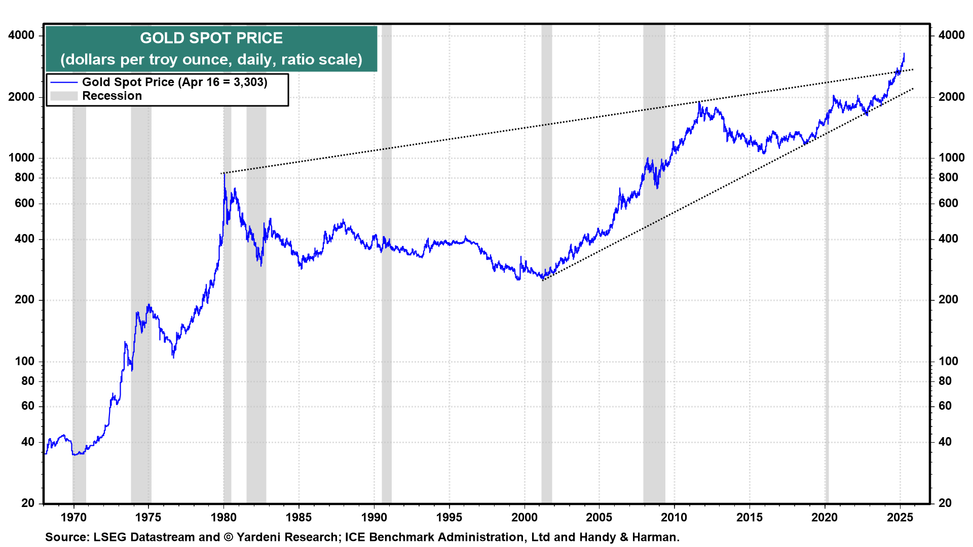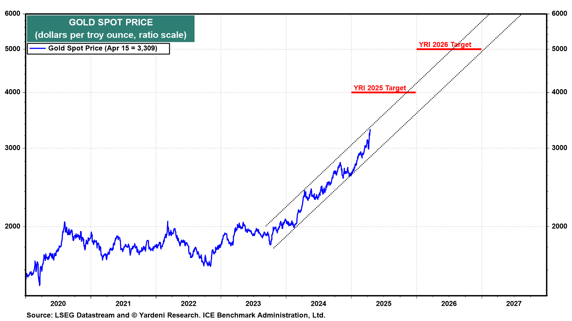 We've been bullish on gold since it broke out above $2,000 per ounce at the end of February 2024. It has been trading in an upward channel since then (chart). It soared to $2,600 by the end of last year. In recent days, it has jumped to a record $3,300, which is the upper end of the channel. Our $4,000 target by the end of this year looks increasingly realistic. If that happens, then $5,000 would be our target for the end of 2026.