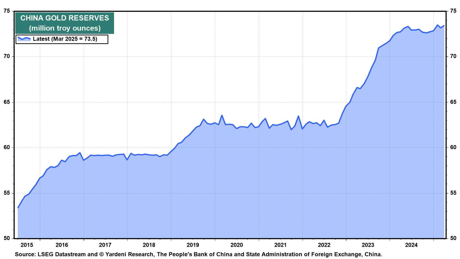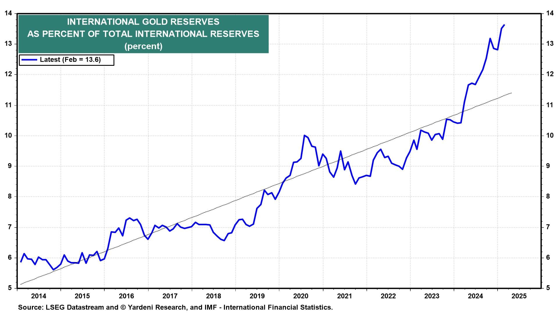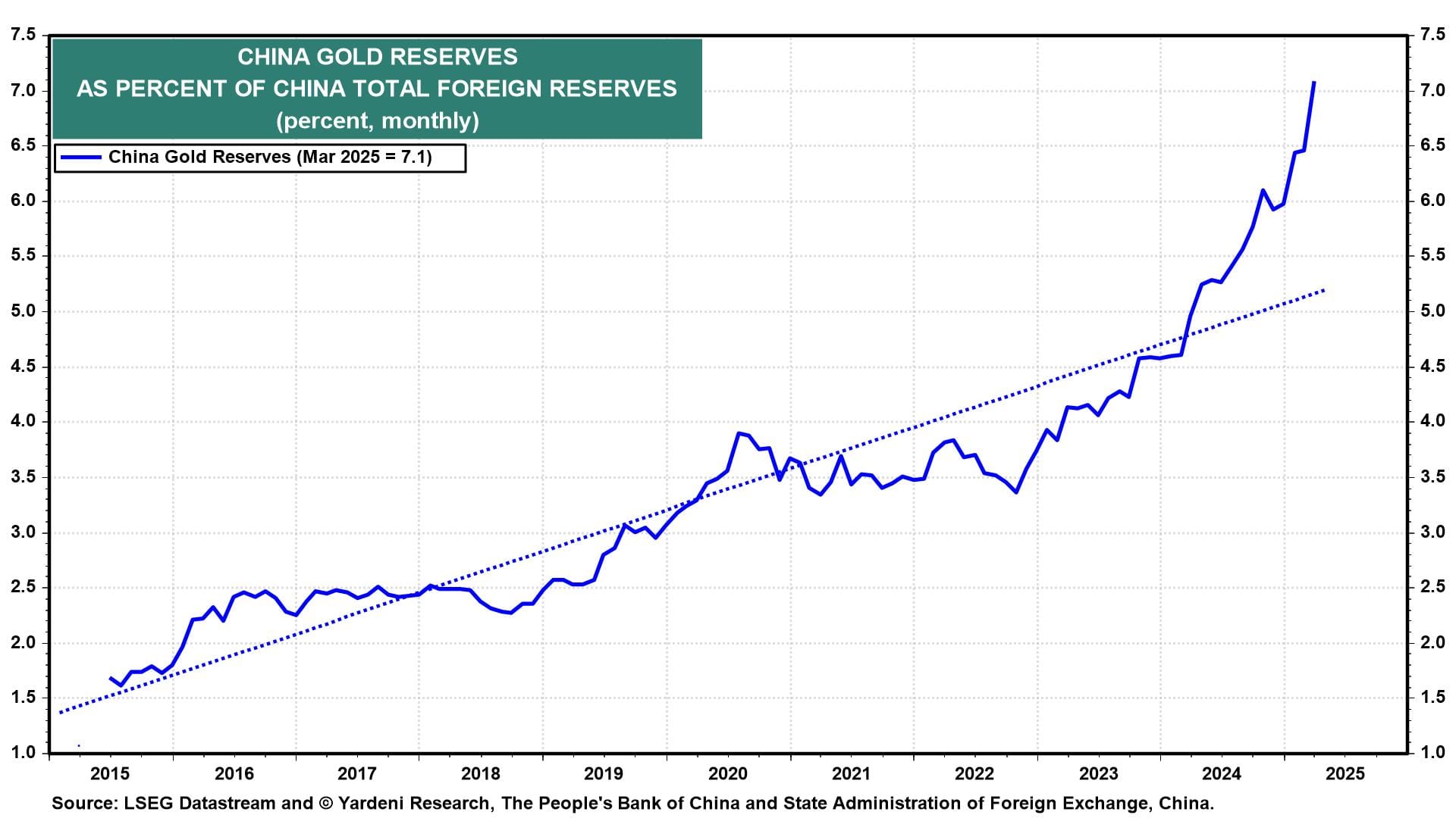 China has been increasing the percentage of its international reserves in gold since late 2022 from about 3.5% to 7.1% currently (chart).