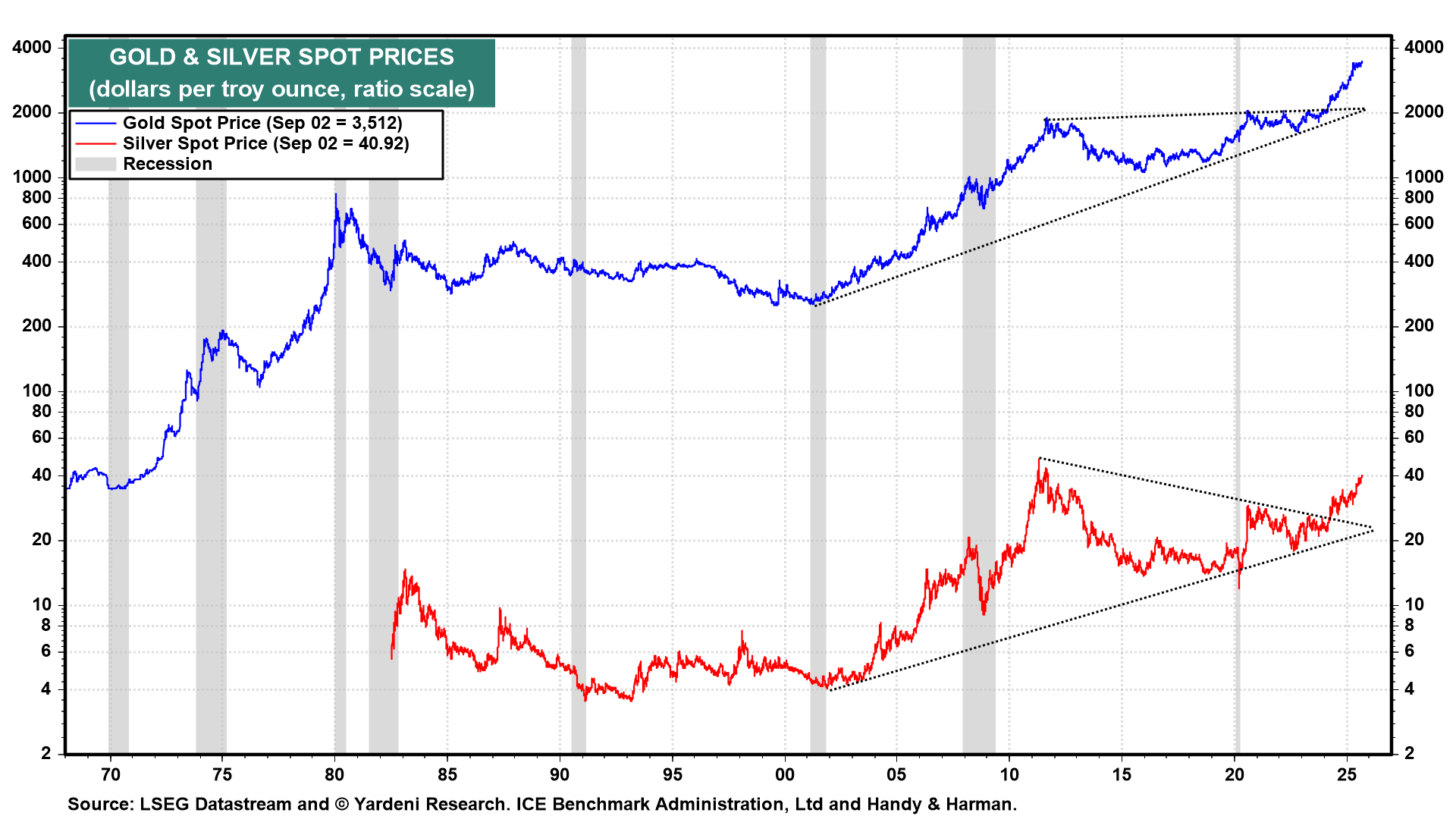 Earlier this year, when the price of gold was slightly below $3,000, we projected that it might remain in the rising channel that started in late 2023, reaching $4,000 by the end of this year and $5,000 by the end of 2026 (chart). So far, so good. Today, the spot price of gold broke out of a recent consolidation pattern to a new record high of over $3,500. The nearby futures contract hit $3,600 today.