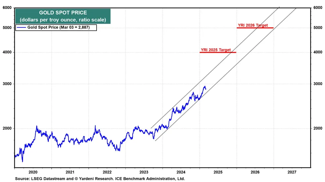 (3) On March 3, 2025, we first provided specific year-end targets for 2025 and 2026: "Meanwhile, the price appreciation of gold has been remarkably steady since late 2023 (chart). The recent pullback has been very moderate so far. We are targeting (not promising) a gold price of $4,000 per ounce by the end of this year and $5,000 by the end of 2026."
