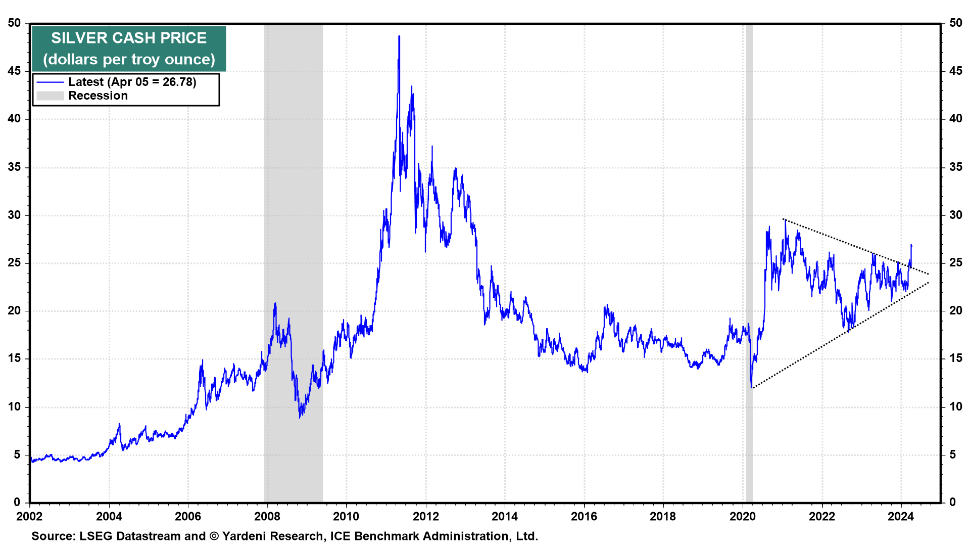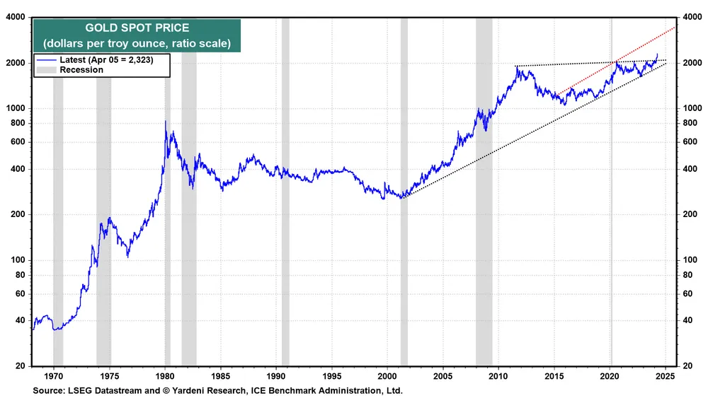 (1) We first turned bullish on the price of gold on April 7, 2024. We noted that it was breaking out above $2000 per ounce to new record highs (chart). We wrote that "$3,000-$3,500 per ounce would be a realistic price target for gold through 2025."