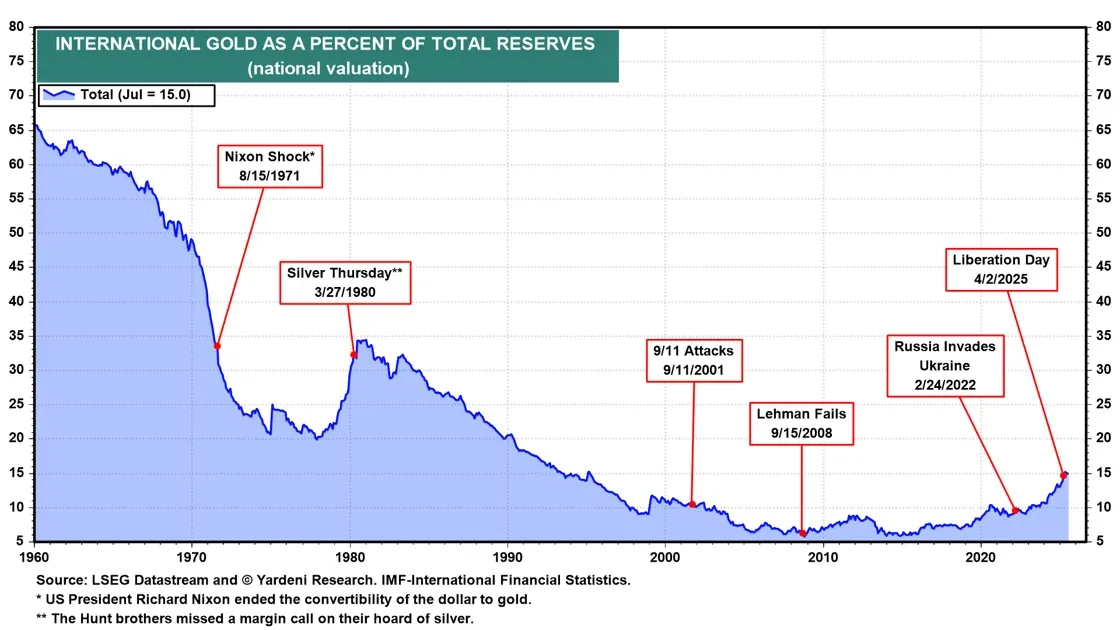 (2) On October 21, 2024, we wrote: "Gold is traditionally viewed as a hedge against inflation, yet it has rallied to new highs as inflation has moderated. Perhaps gold is now a hedge against US economic sanctions. After Russia invaded Ukraine in February 2022, Russia's foreign exchange reserves held by the US and its allies were frozen. Since then, some officials and commentators have proposed seizing those assets, which amount to nearly $300 billion, and using the proceeds to defend and rebuild Ukraine. Not surprisingly, China and other countries have been increasing their allocations of gold in their countries' international reserves."