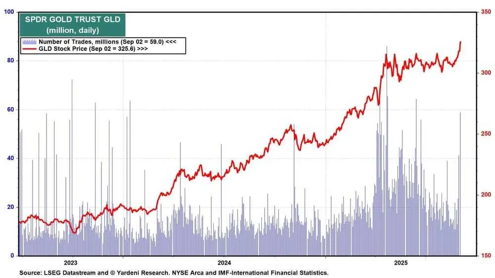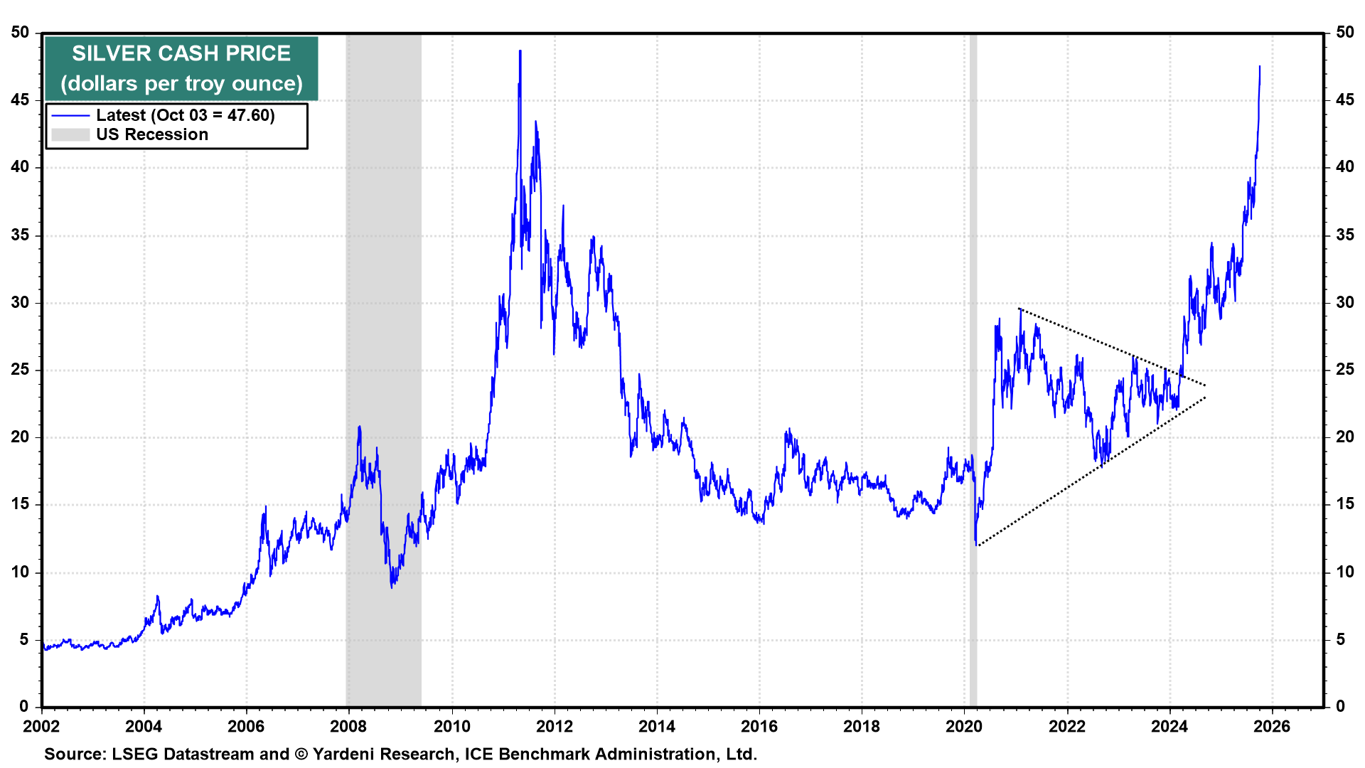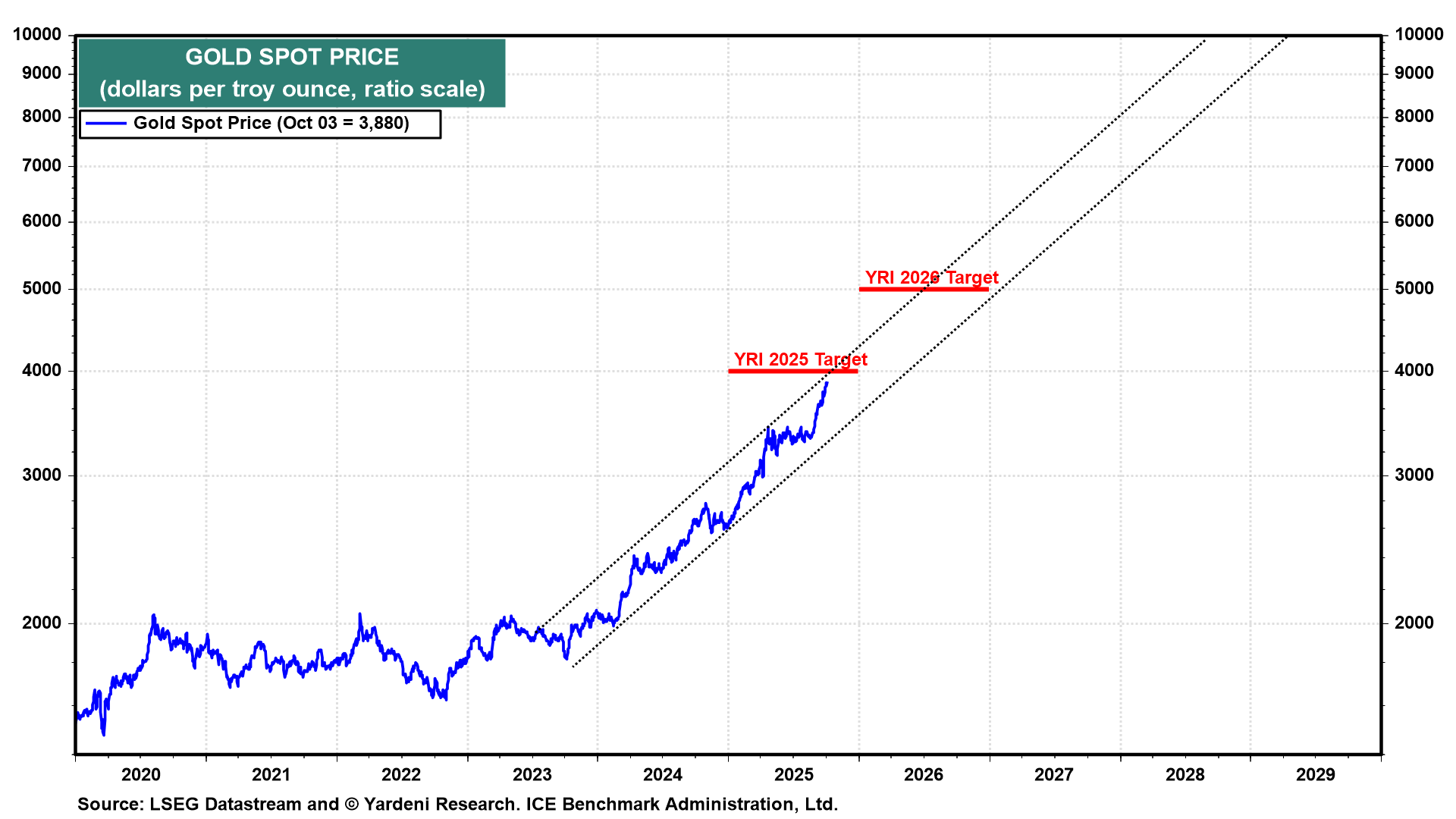 (6) So far, so good (chart). The price of gold is within shouting distance of our $4000 target for 2025. We are now aiming for $ 5,000 in 2026. If it continues on its current path, it could reach $10,000 by the end of the decade.