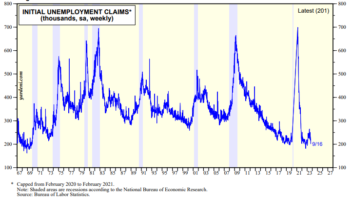 The Fed's hawkish pause has unsettled the bond and stock markets. During 2022 and early 2023, the widespread fear was that the Fed's tightening of monetary policy would send the economy into a recession, depressing corporate earnings and the stock market. Now the fear is that stronger-than-expected economic growth will force the Fed to maintain its restrictive stance for some time. So good news is bad news. Today's selloff in bond and stock prices was partly attributable to this morning's good news, i.e., the drop in initial unemployment claims (chart).