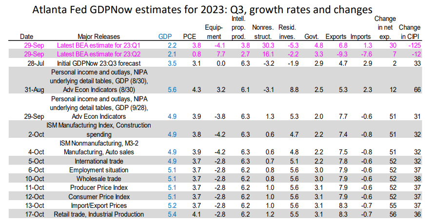 Today's September reports for retail sales and industrial production were better than expected. The Atlanta Fed's GDPNow tracking model shows real GDP grew 5.4% (saar) during Q3, up from 5.1% on October 10. Leading the estimate higher is real consumer spending with a 4.1% increase (table).
