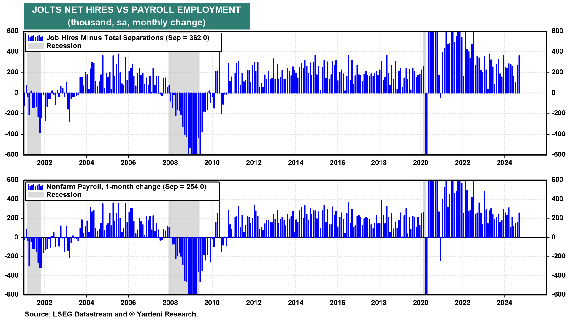 (1) JOLTS. Payrolls rose 362,000 in September according to our JOLTS-based proxy, which subtracts separations from hires (chart). That more than confirms September's strong 254,000 jump in payroll employment.