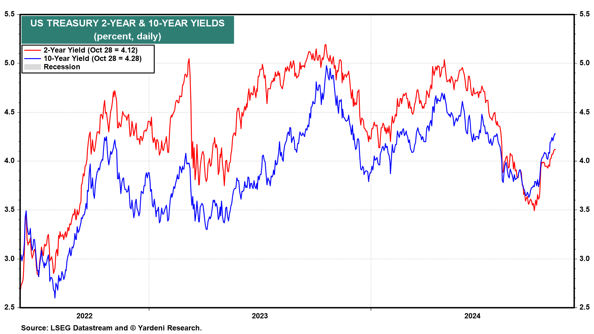 Financial markets seem to be sensing that. The S&P 500 turned positive this morning after both labor market reports were released. The latest data confirm fixed income investors' concerns that the Fed is stimulating an overheated economy that continues to be stimulated by large federal government budget deficits (chart).