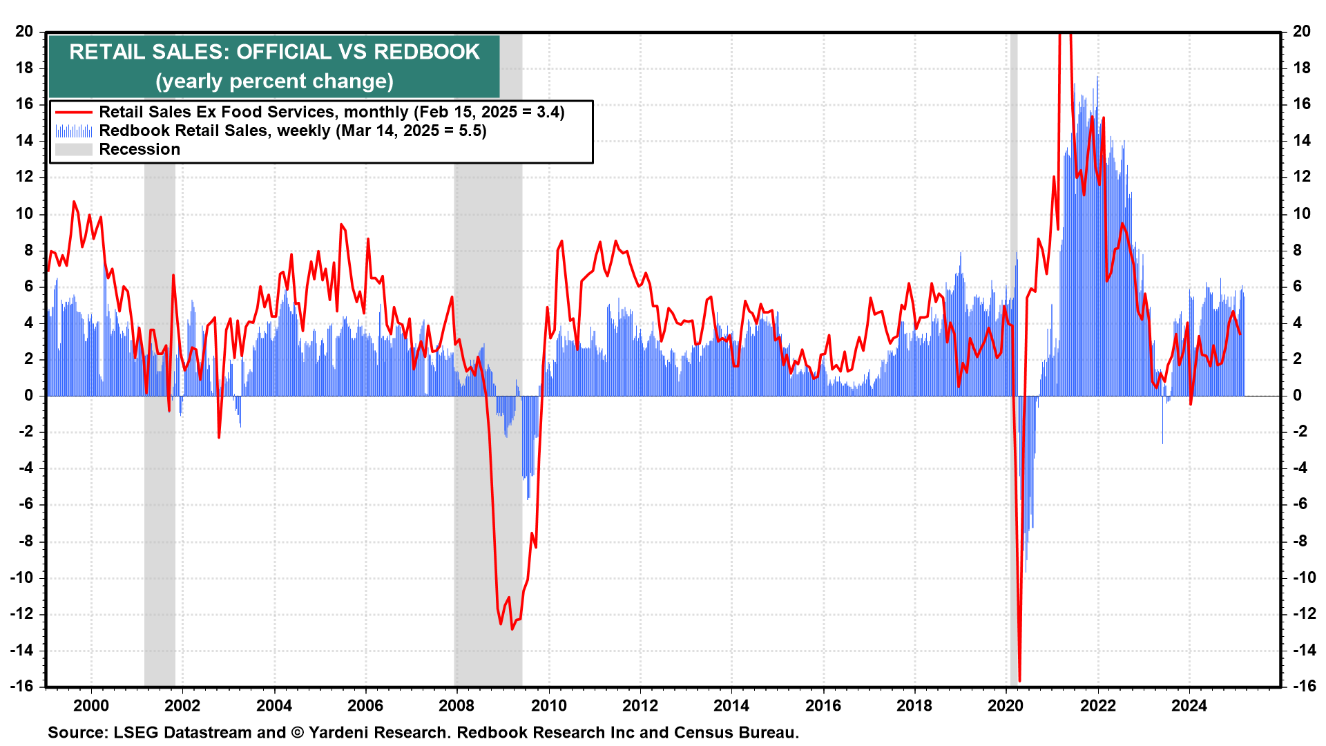 (1) The weekly Redbook retail sales index rose 5.5% y/y through the week of March 15 (chart). That's a solid reading in light of the recent drop in consumer sentiment measures.