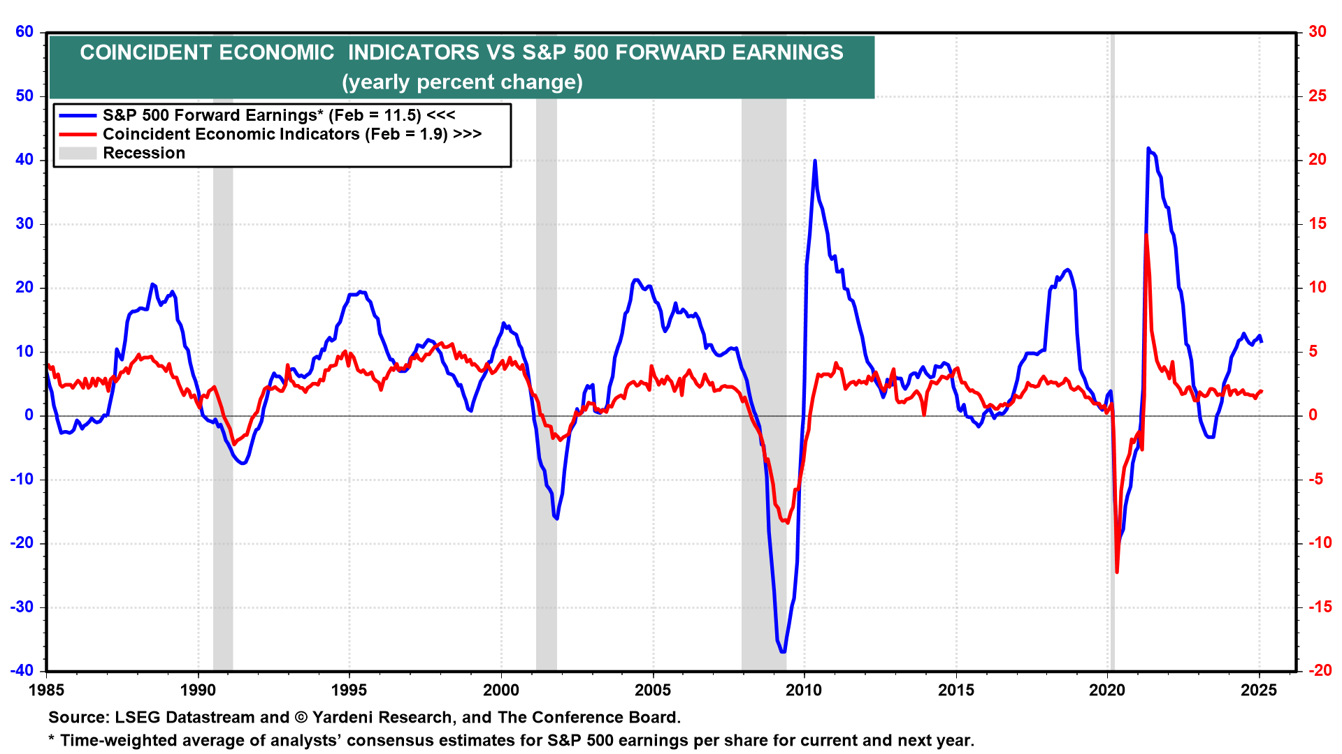 (2) Another upbeat indicator is S&P 500 forward earnings, which rose to another record high during the March 20 week. Its level and y/y growth rate coincide with those of the Index of Coincident Economic Indicators (chart). The former rose 11.5% y/y through February. That's a solid reading.