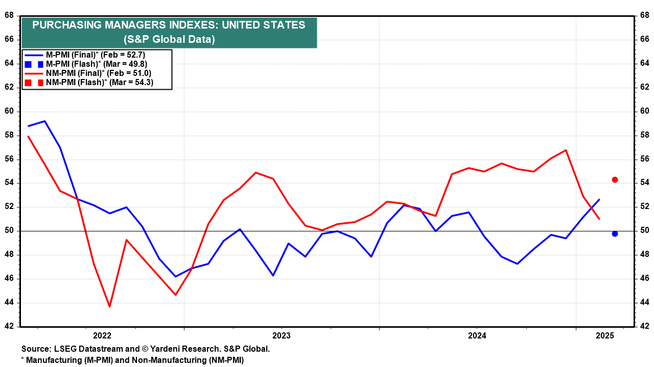 (3) If you are looking for bad news, there was some in the S&P Global flash manufacturing PMI for March. It fell from 52.7 in February to 49.8 this month (chart). However, the flash nonmanufacturing PMI jumped from 51.0 to 54.3.