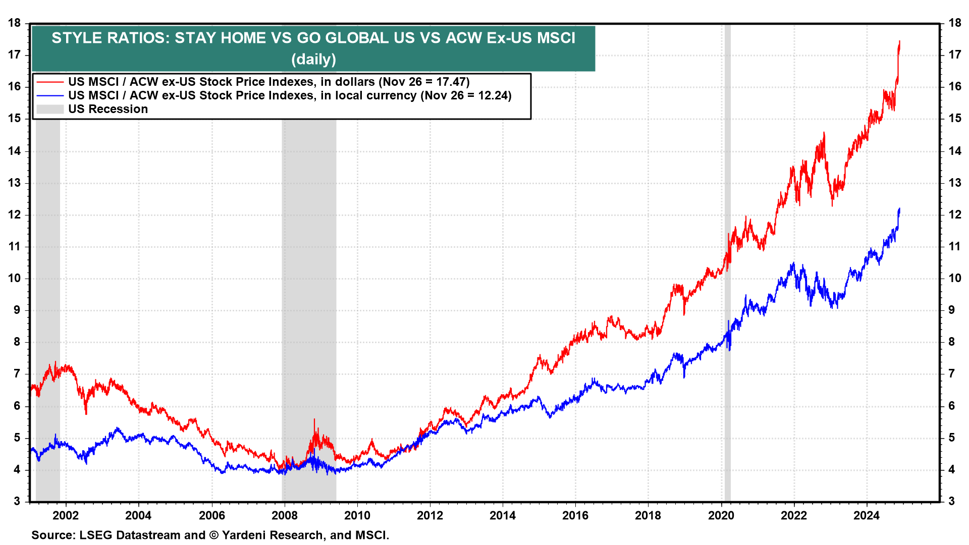 This is the time of the year when we all count our blessings. The Yardeni Research team thanks you for your interest in our research. We wish you a great Thanksgiving tomorrow with your family and friends at your home or theirs. Since 2010, we've been recommending a Stay Home investment strategy, i.e., overweighting the US in global equity portfolios, rather than a Go Global strategy. So far, so good (chart).