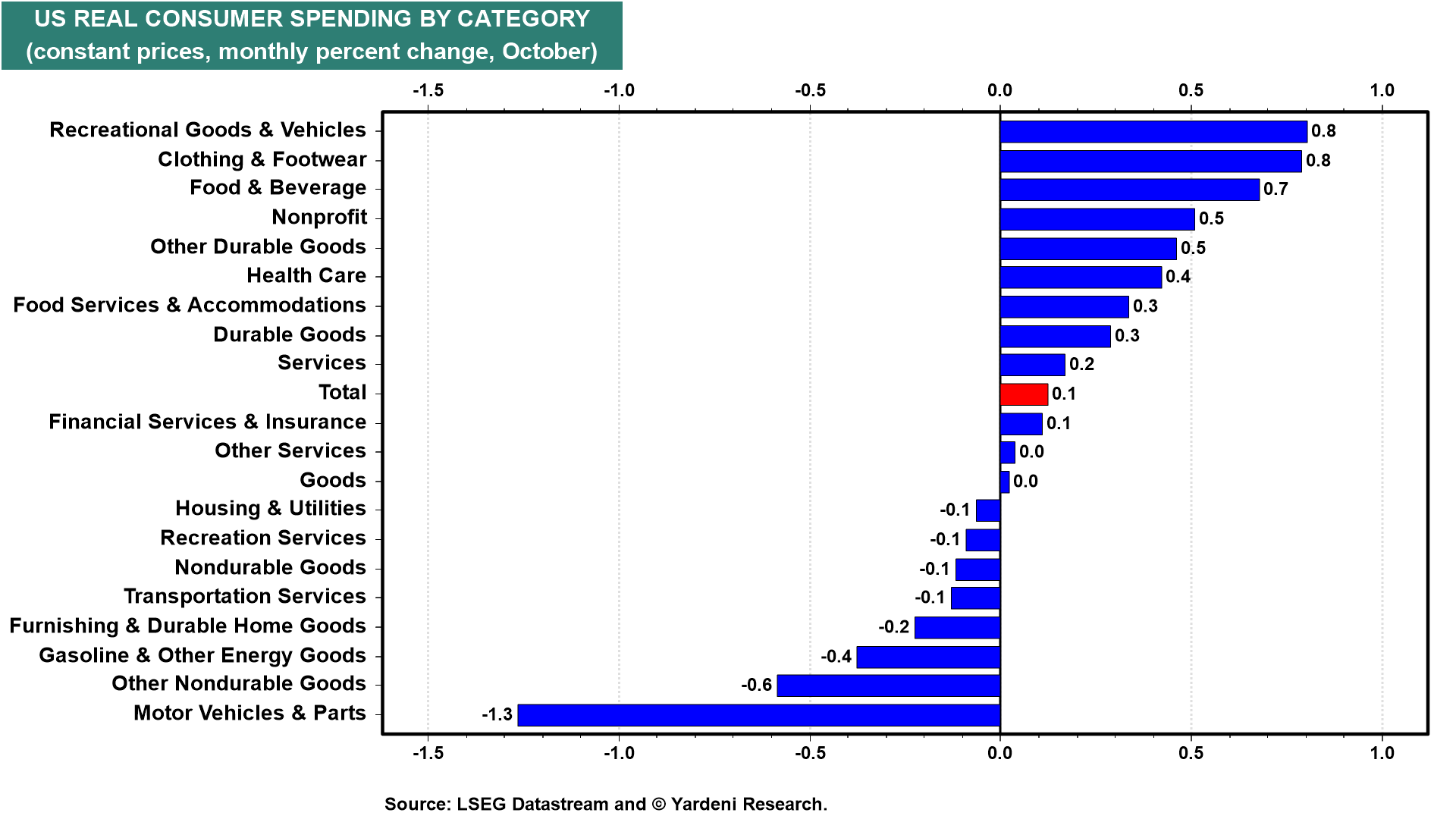 (2) Personal income & outlays. Real disposable personal income rose 0.4% m/m during October. The 0.1% increase in real personal consumption expenditures in October reflected an increase of less than 0.1% in spending on goods and an increase of 0.2% in spending on services (chart). That was enough to boost GDPNow's Q4 estimate for real consumption from 2.8% to 3.0%.