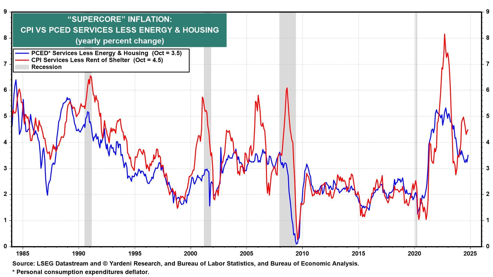 (1) PCED inflation. The Fed's preferred inflation gauge, core PCED, rose 0.3% m/m and 2.8% y/y in October. That was the same increase on a monthly basis and up from 2.7% y/y in September. However, October's supercore (core services excluding housing) PCED inflation rose to 3.5% y/y (chart). Two years ago, Fed Chair Jerome Powell said this was the best gauge of underlying inflation. Today, it's 150bps north of the Fed's 2.0% target for the overall core PCED. We think that Fed officials will pause their rate cutting. If not, they risk overheating the economy and fueling a stock market meltup.