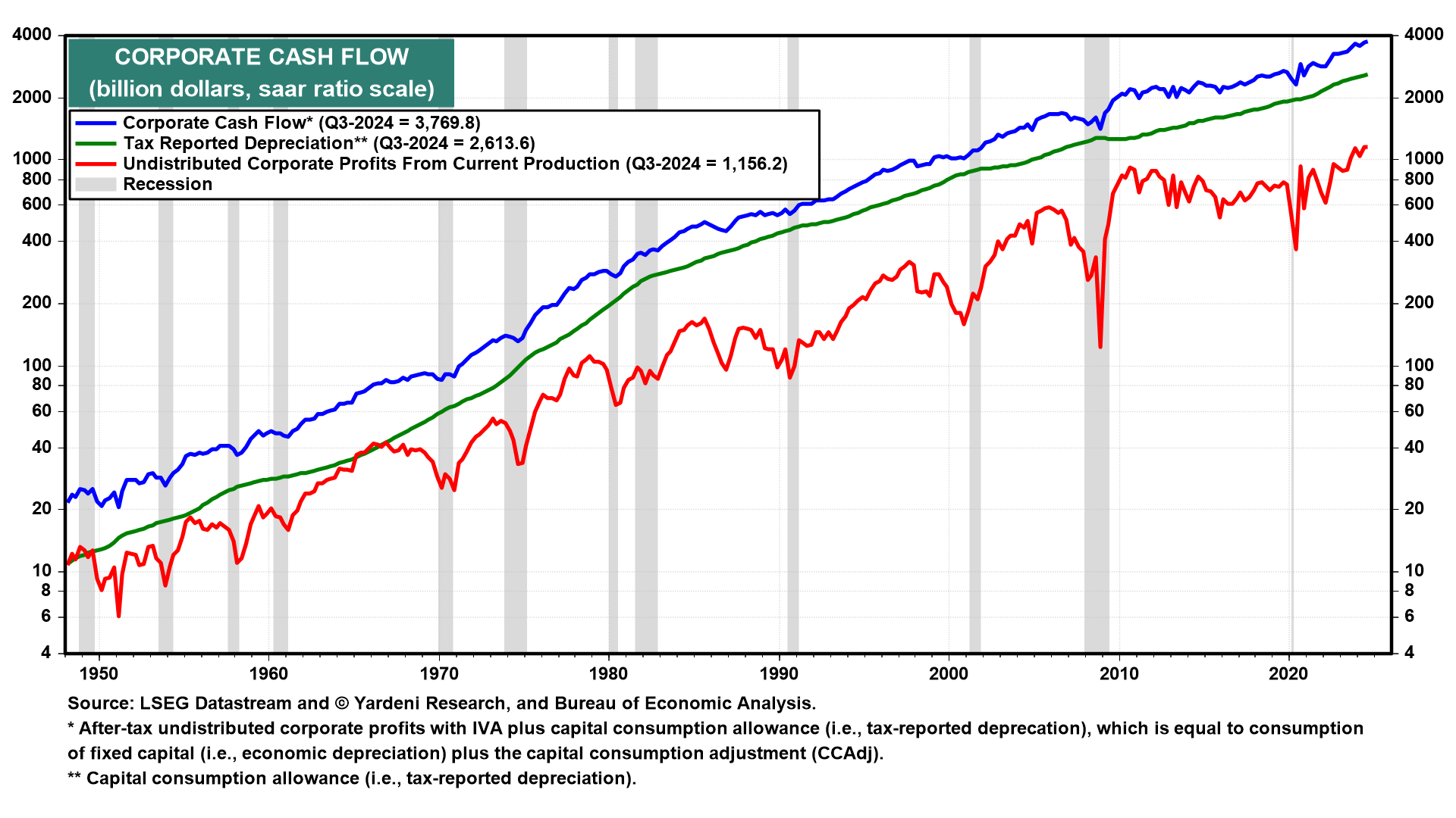 (3) Corporate profits. Q3's corporate profits from current production remained close to its Q3 record high. Corporate cash flow rose to a record $3.8 trillion last quarter (chart). Corporations have plenty of cash to finance record capital spending, especially on technology.