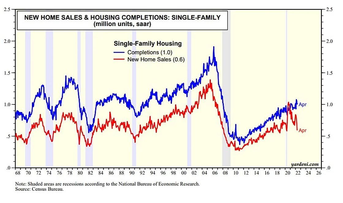 There's lots of stagflation in the new home market. During April, new home sales (registered when contracts are signed) dropped 16.6% m/m and the months' supply of new homes jumped to 9.0 from 6.9 in March. Here's more: