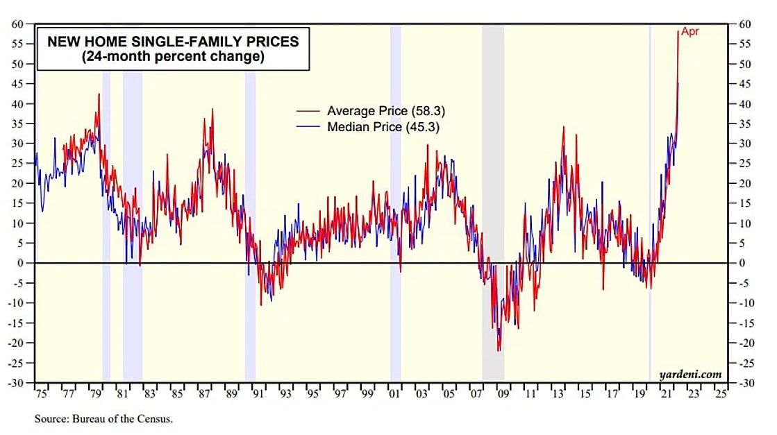 (2) The median price of a new home rose 19.6% y/y to a record $450,600. It is up 45.3% over the past 24 months, while the average price is up 58.3% over the same period!