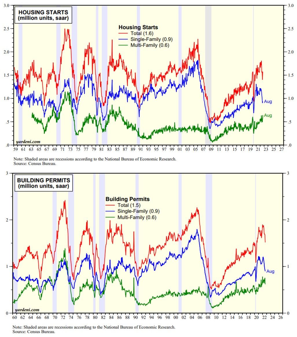 Building permits for both single-family and multi-family houses fell sharply in August (chart below). Total building permits is one of the 10 components of the Index of Leading Economic Indicators.