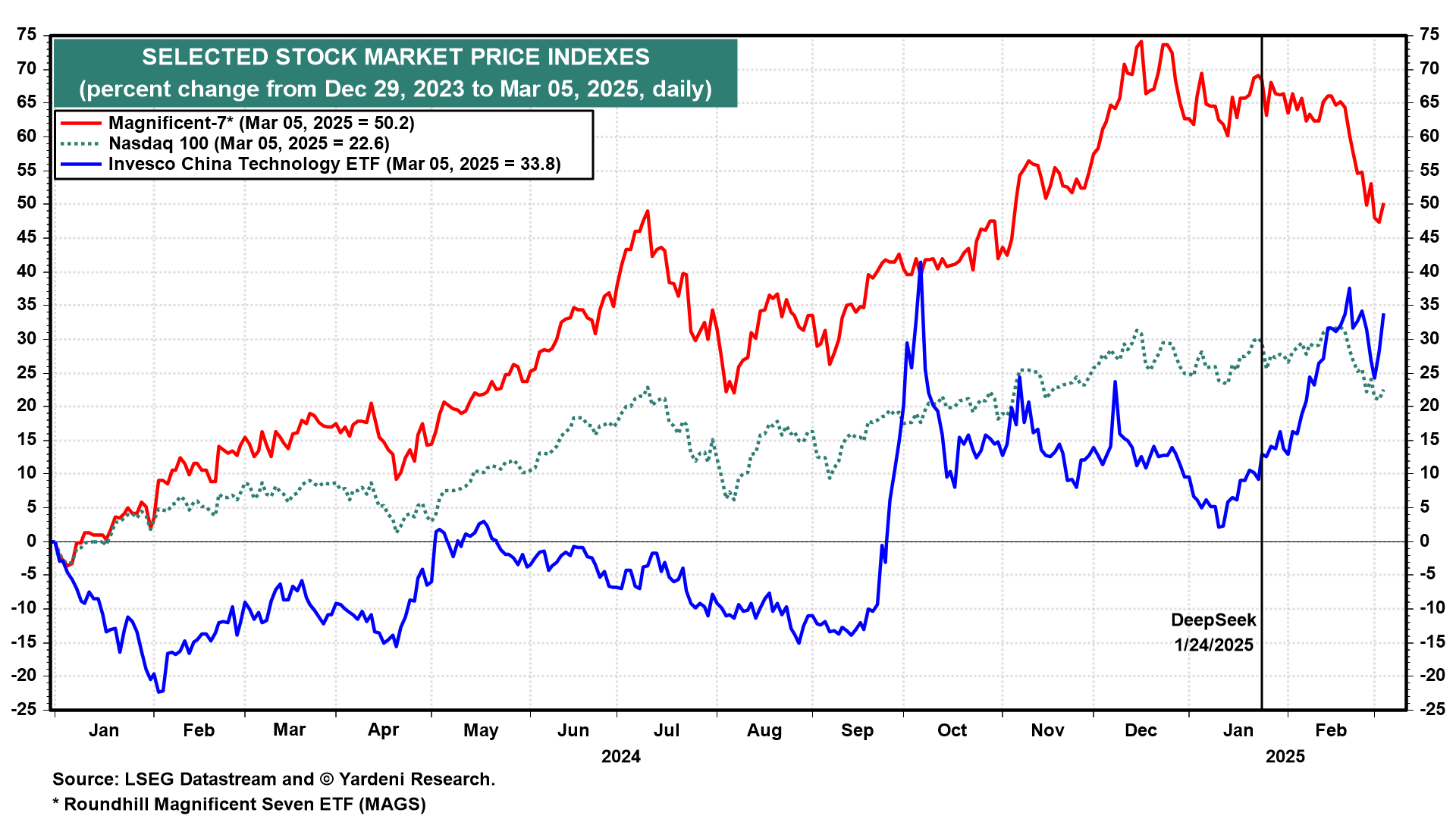 (4) Will Chinese stocks continue to rally led by technology stocks? The Chinese government is responding to Trump Tariffs 2.0 with more stimulative measures. US technology stocks, including the Magnificent-7, might be bottoming.