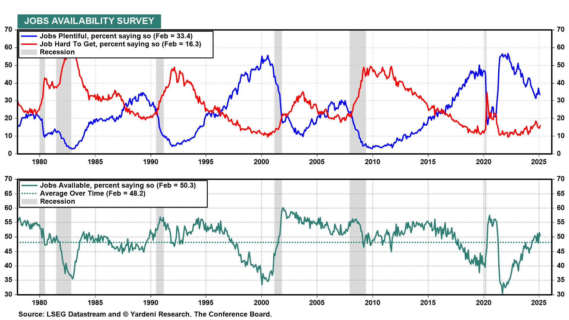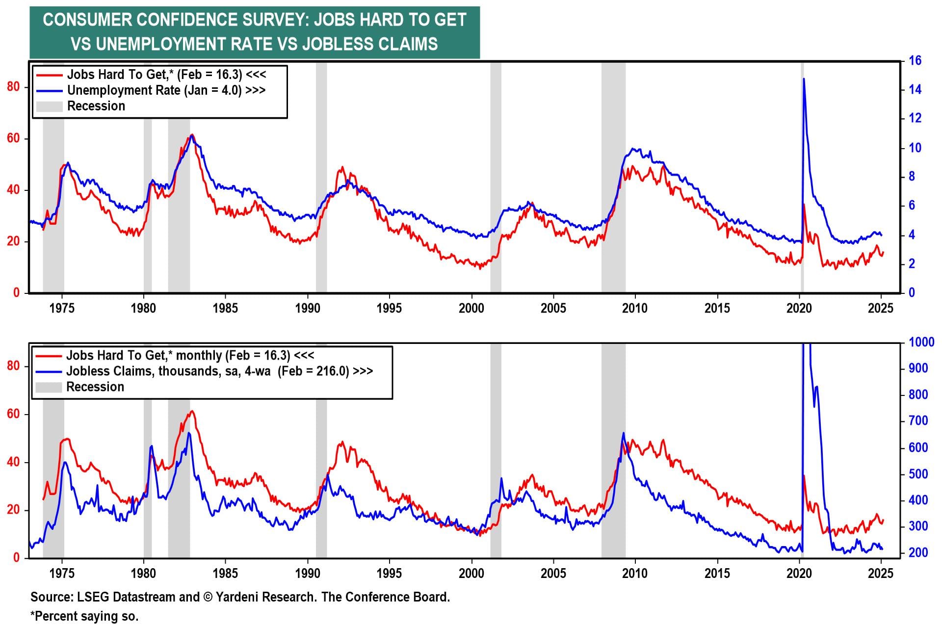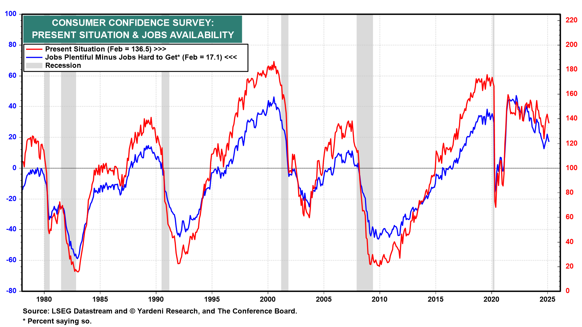 (5) The drop in the CCI expectations component reflects the decline in the "same number of jobs in 6 months" response from 68.8% during July 2024 to 55.7% currently. The "fewer jobs in 6 months" response jumped from 21.0% in January to 25.9% in February. This may reflect all the news about federal job reductions under Trump 2.0.